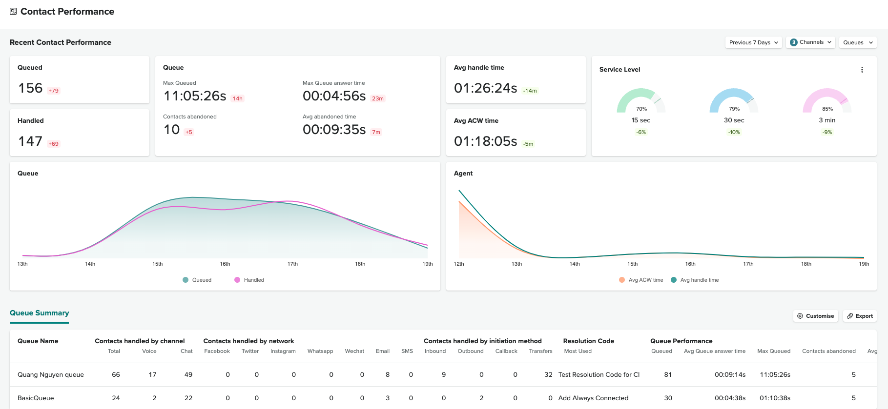 Engage's Contact Performance dashboard enables you to gauge the performance of each queue based on various metrics.
