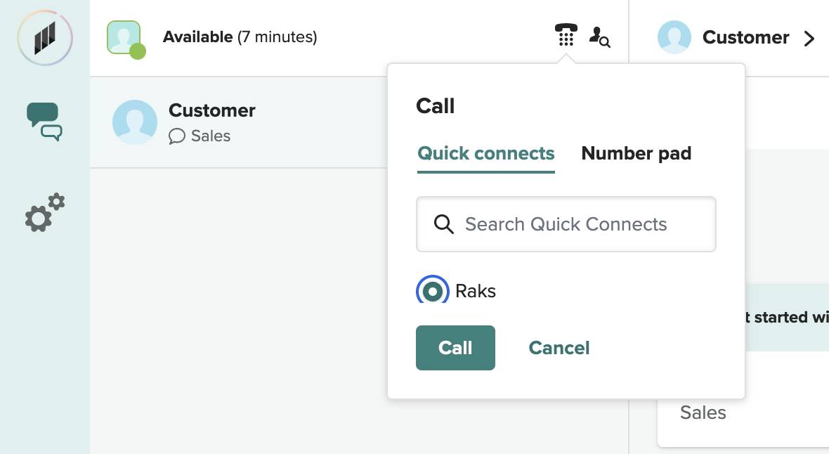 Once you click on the telephone icon, you can either make a call to an external number via Quick connect that has been set up or you can click on the Number pad to dial a number yourself.
