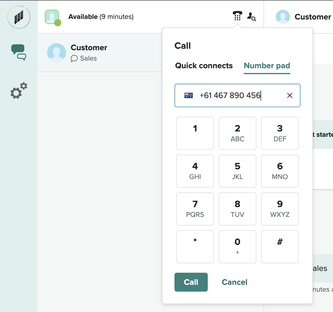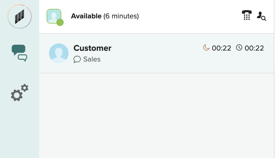 To initiate an outbound call whilst in Chat conversation, select the telephone icon next to your agent status in the top left hand corner of the screen.