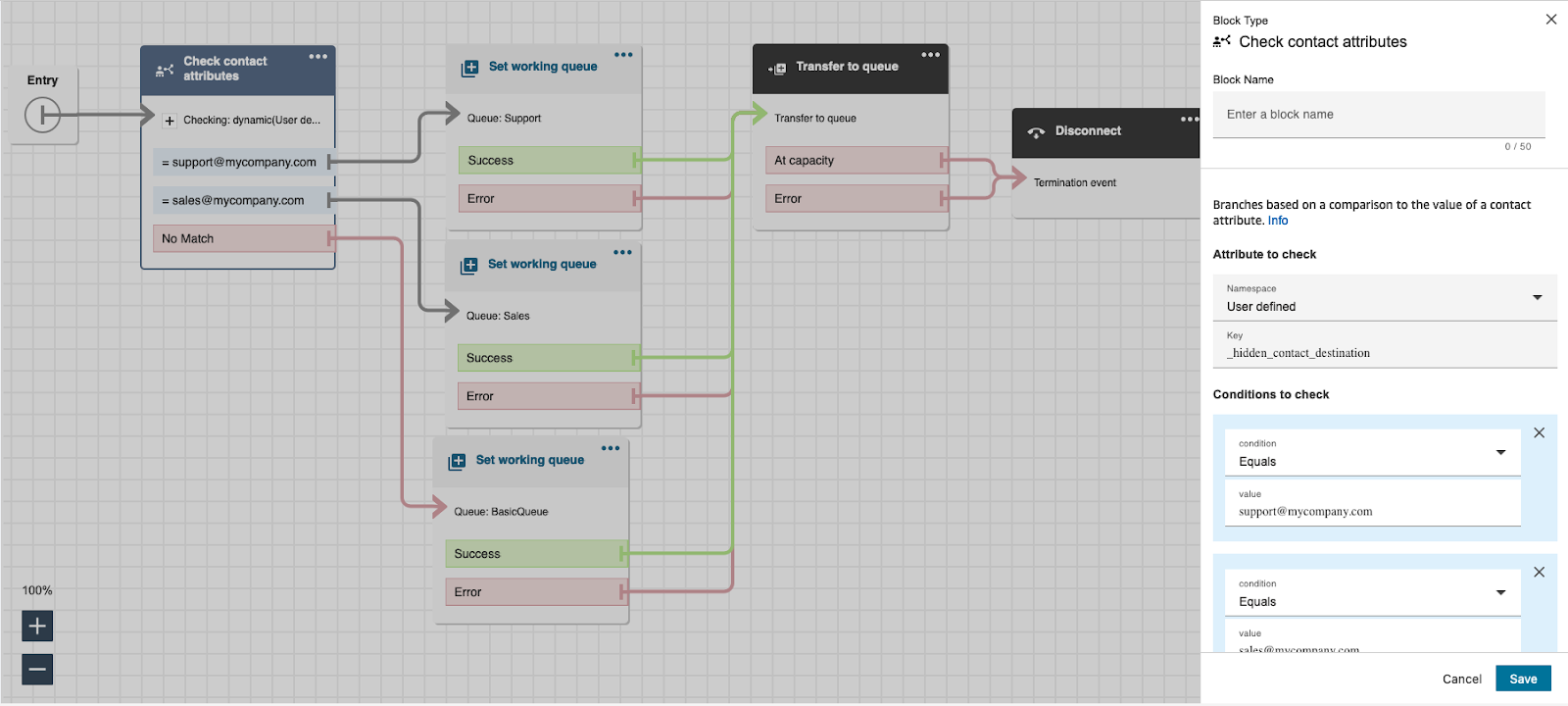 Various aspects of the email can be used to make routing decisions. The simplest example of this is using the '_hidden_contact_origin' (From email address) or '_hidden_contact_destination' (To email address) to make routing decisions. The below image shows how the '_hidden_contact_destination' attributes can be used to route emails sent to different email addresses to different queues: