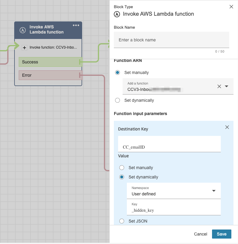 Ensure to change the 'Destination Key' name to match the name of the variable expected in your Lambda code. Specify the Value to be dynamic and set the key to '_hidden_key' as shown above. The '_hidden_key' attribute contains the required information of where the email is stored in S3.