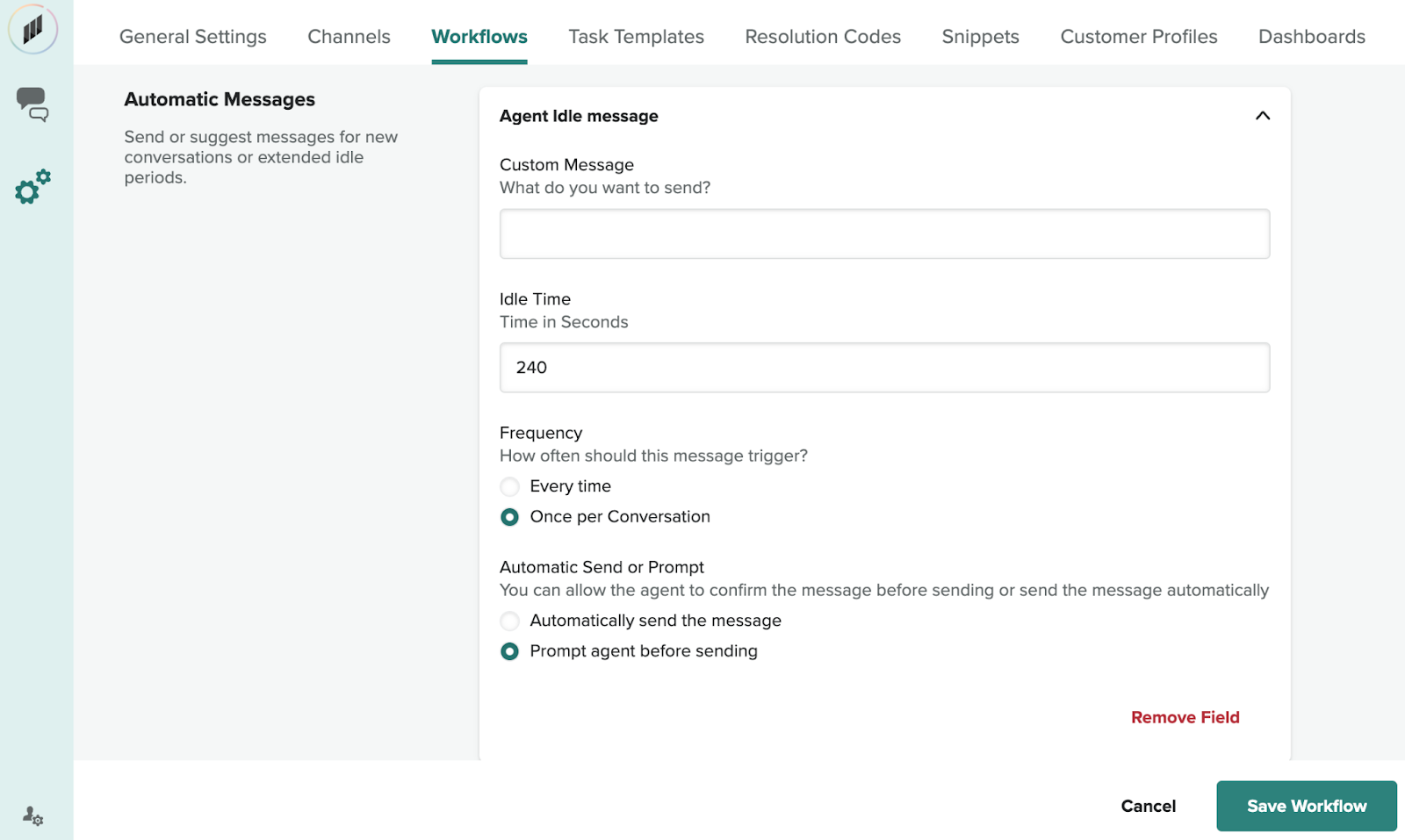 To add an Idle message, click on either Agent idle or Customer idle in your Automatic Messages section under the Workflows tab.