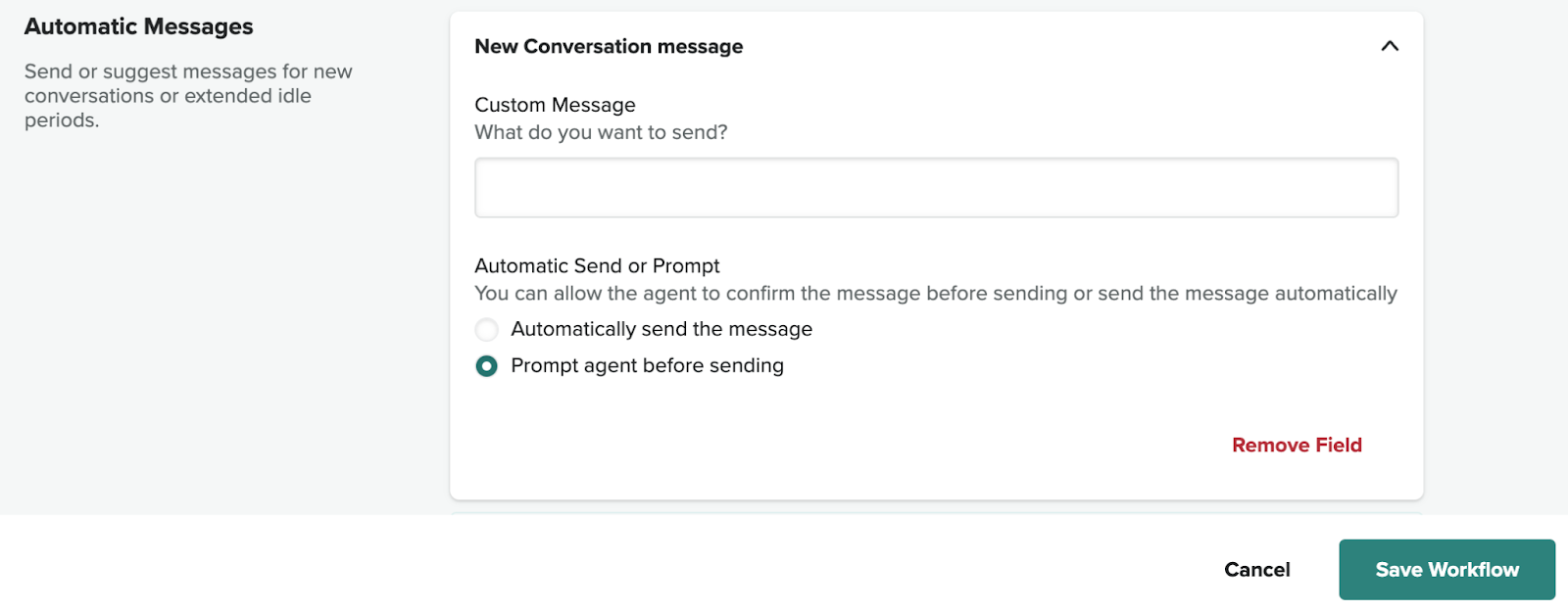 Add a custom welcome message and select whether it must be sent automatically or if the agent should be prompted before sending it.