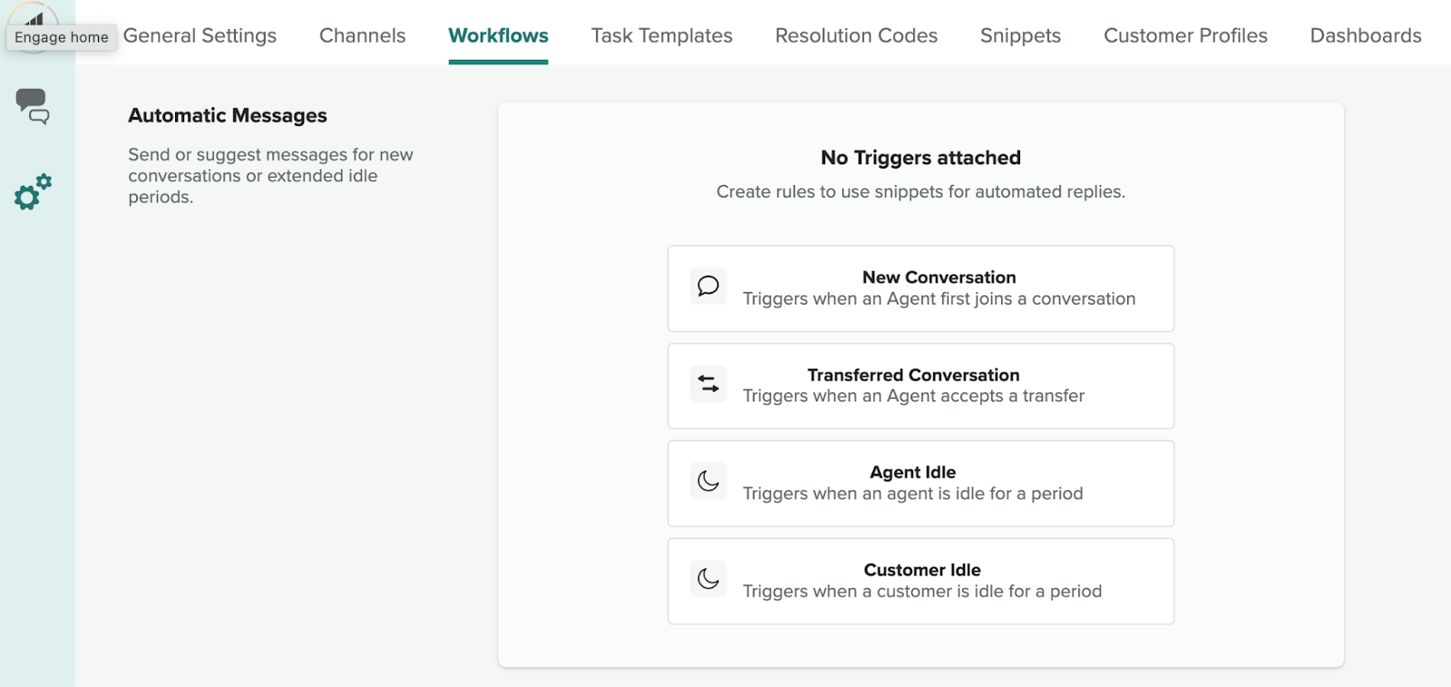 Automatic messages are triggered when a new conversation comes into the inbox or when either the agent or customer has been idle for a while. You will need Administrator access in Engage in order to configure automatic messages.