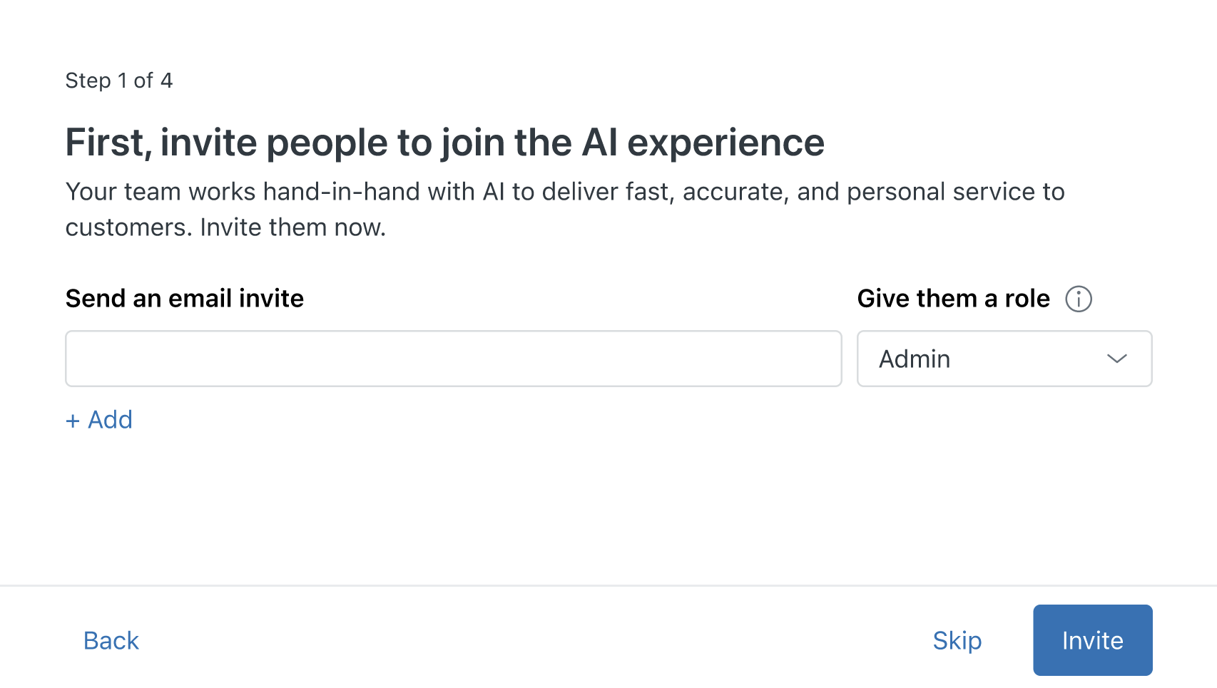 Inviting other team members gives them access to the Zendesk Suite trial and provides them with an opportunity to try out an AI agent. Team members act as agents and admins to help you manage support requests. You can add up to four additional team members to your trial account. To learn more about team members, see Adding agents and admins.
