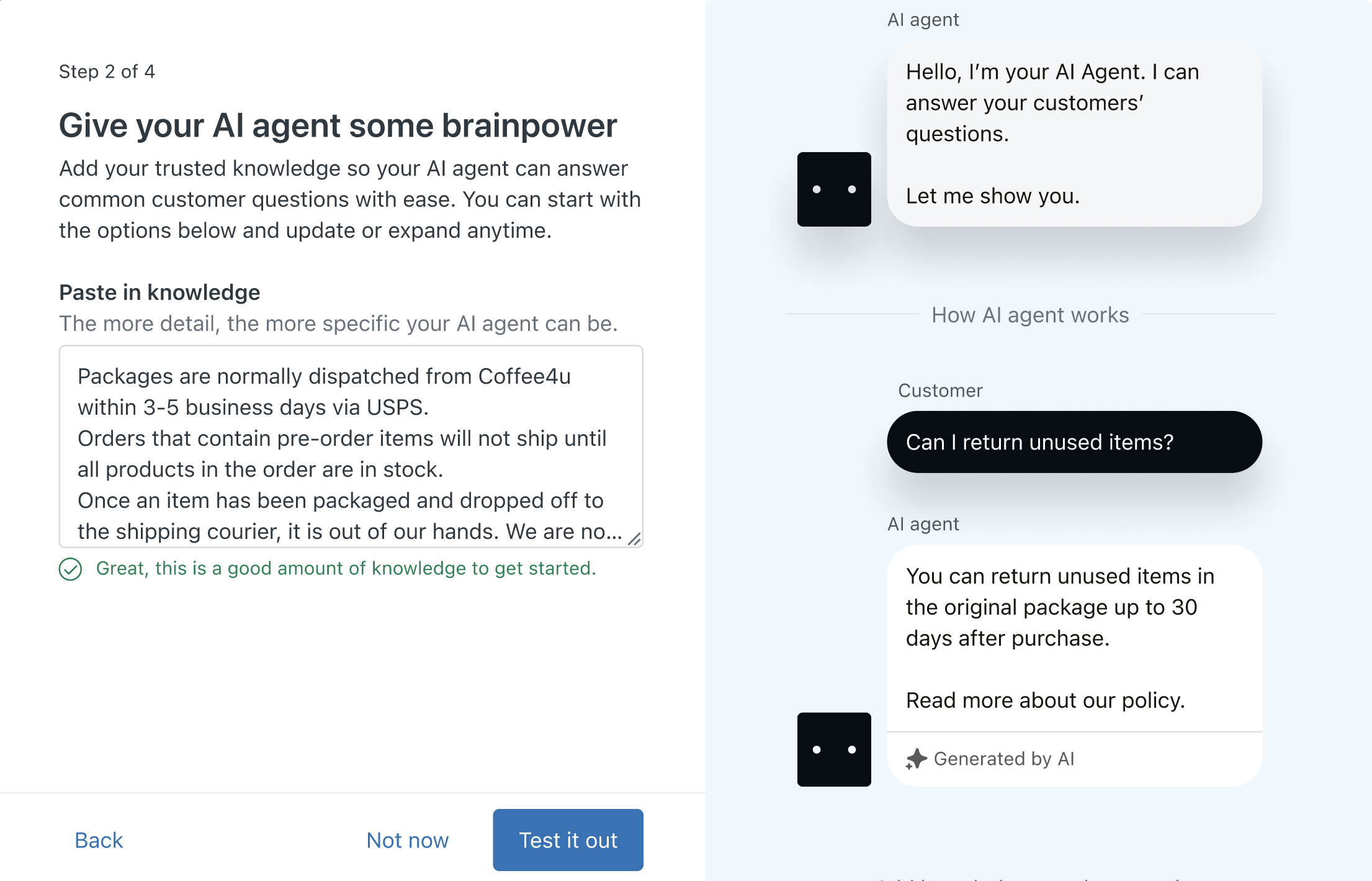 To train the AI agent, provide some knowledge you have to answer common questions that customers ask. This can be material you’ve used before to answer customer questions. For example, it can be a description of shipping schedules or product return requirements. To learn more about providing knowledge for AI agents, see Strategies for building up your help center content for AI.
