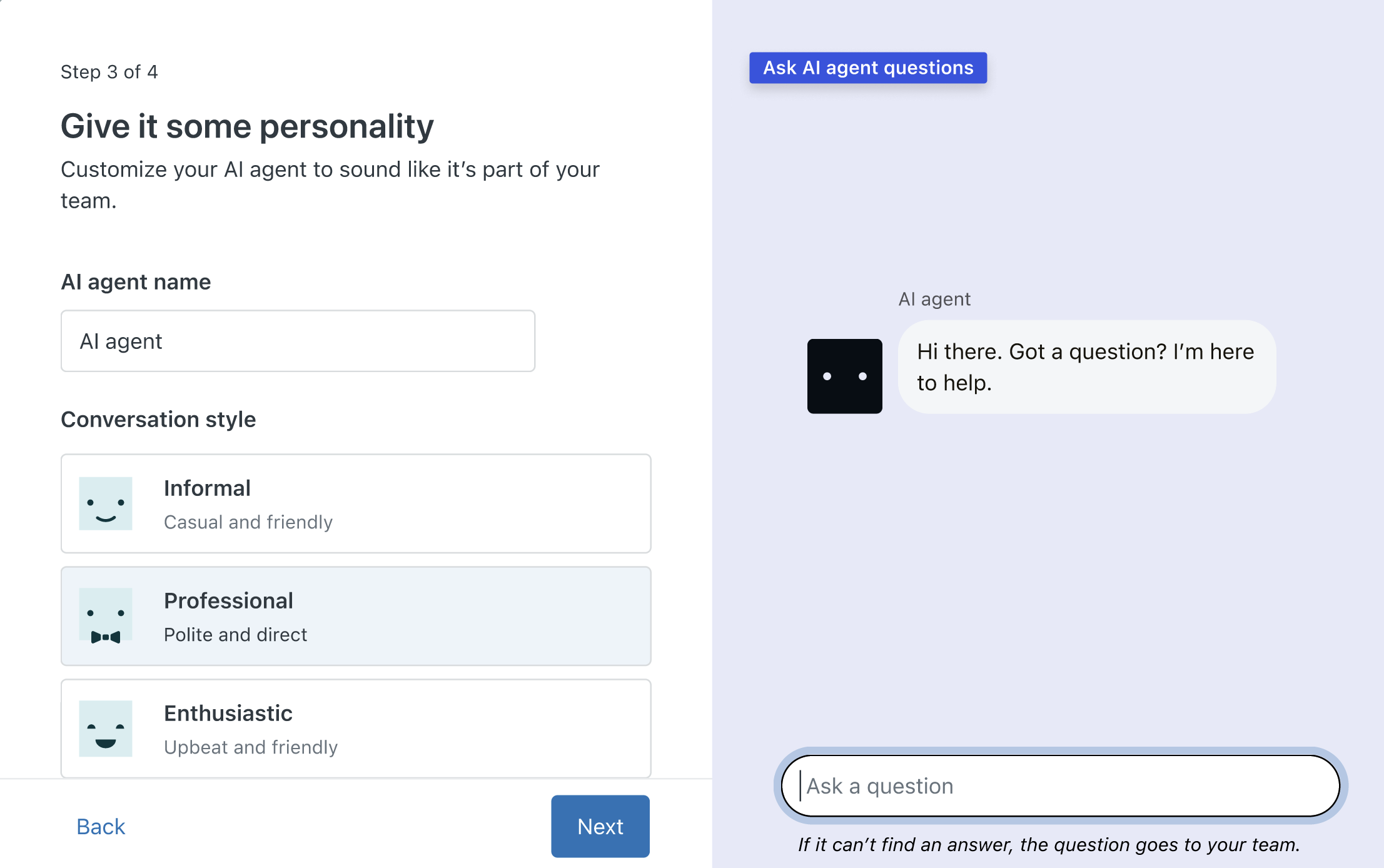 You can control how AI agents respond to customers by giving the AI agent a name and picking a conversation style. These elements set the tone for how you want to connect with customers. For more information, see Configuring an AI agent persona.