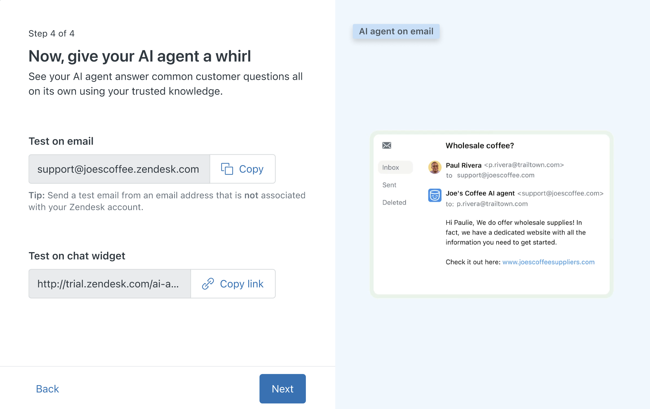 Important: When you test with an email, be sure to send your question from an email address that's different from the email address you used to create your Zendesk account. Otherwise, you won't receive an automatic reply from the AI agent.