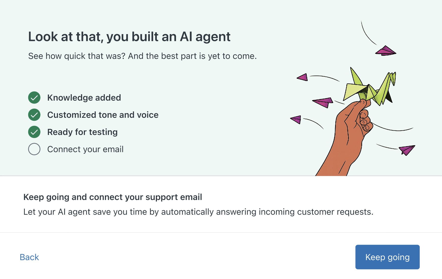 After you’ve finished connecting your support email, you can add your own permanent AI agents and knowledge articles to your account and get them working for you. For more information, see Getting started with AI agents - Essential.