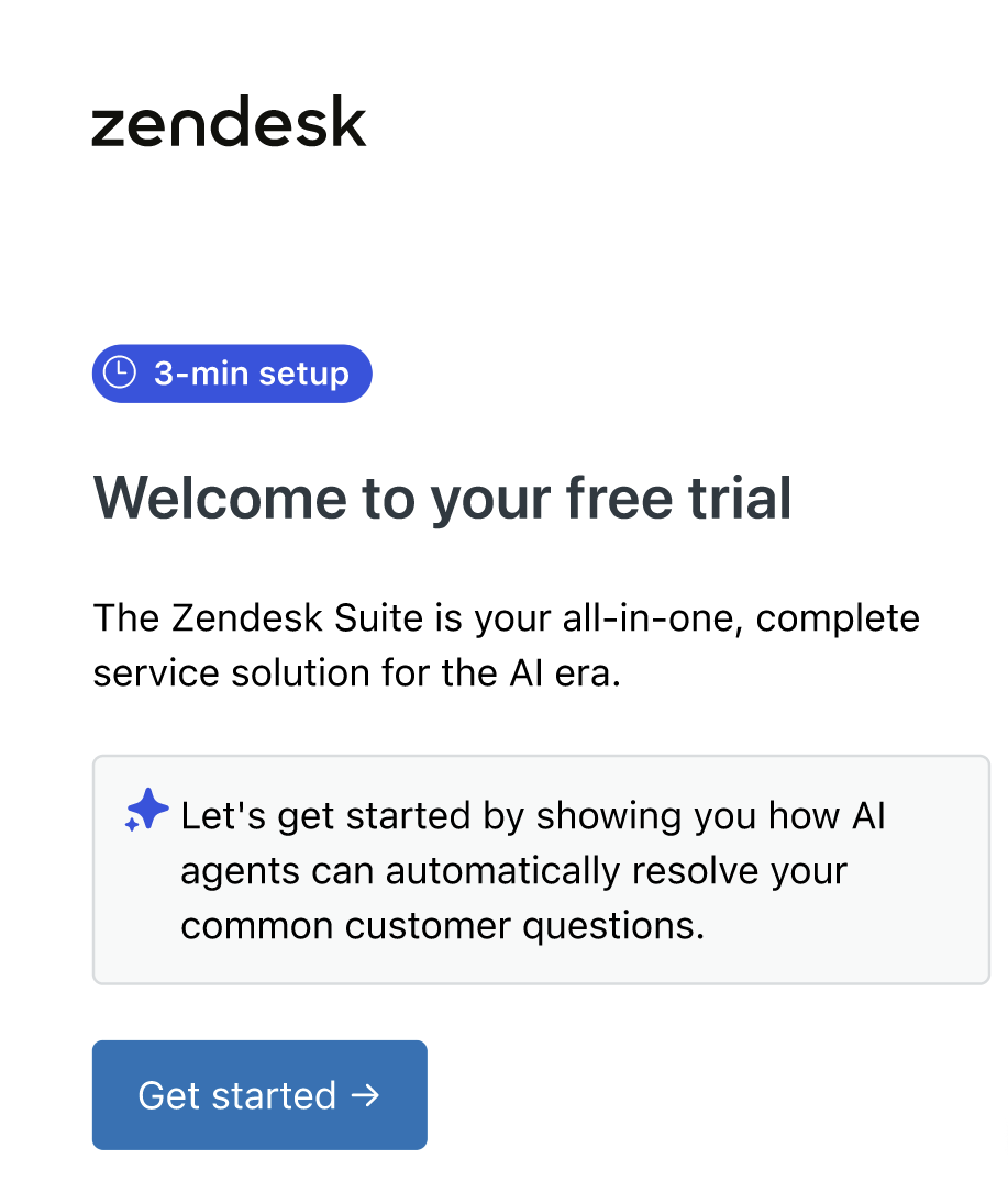 If your account is eligible, your Zendesk Suite trial provides you with a setup wizard that you can use to try out our latest AI technology. The wizard shows you how AI agents can automatically resolve common customer questions. To learn more, see About AI agents.