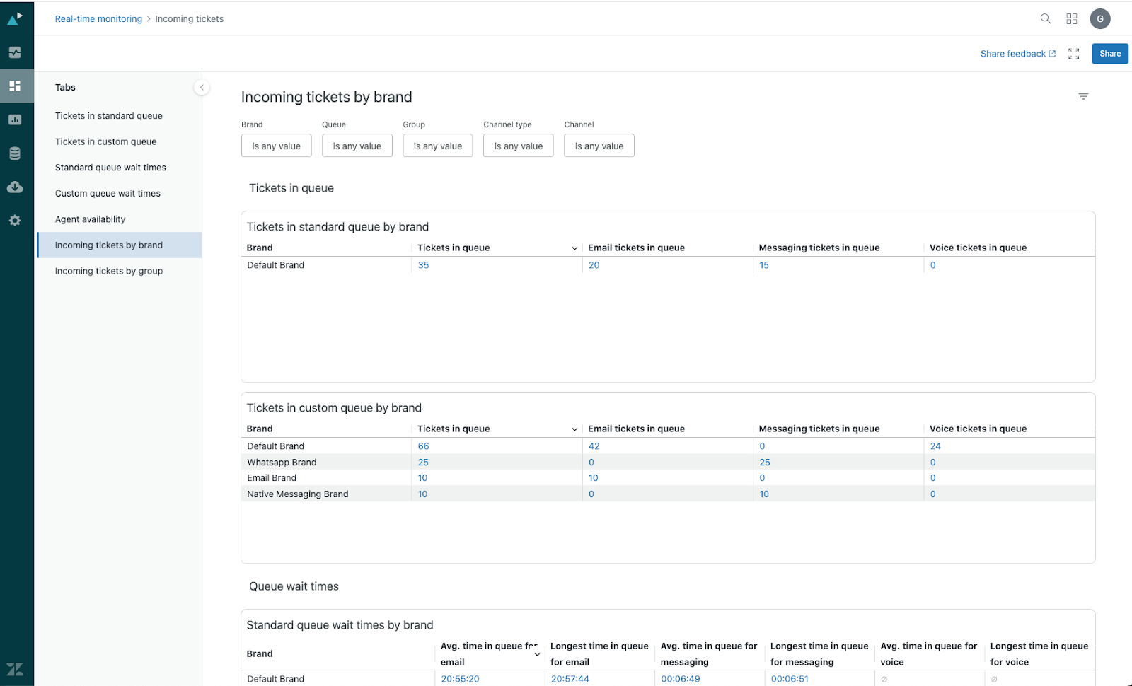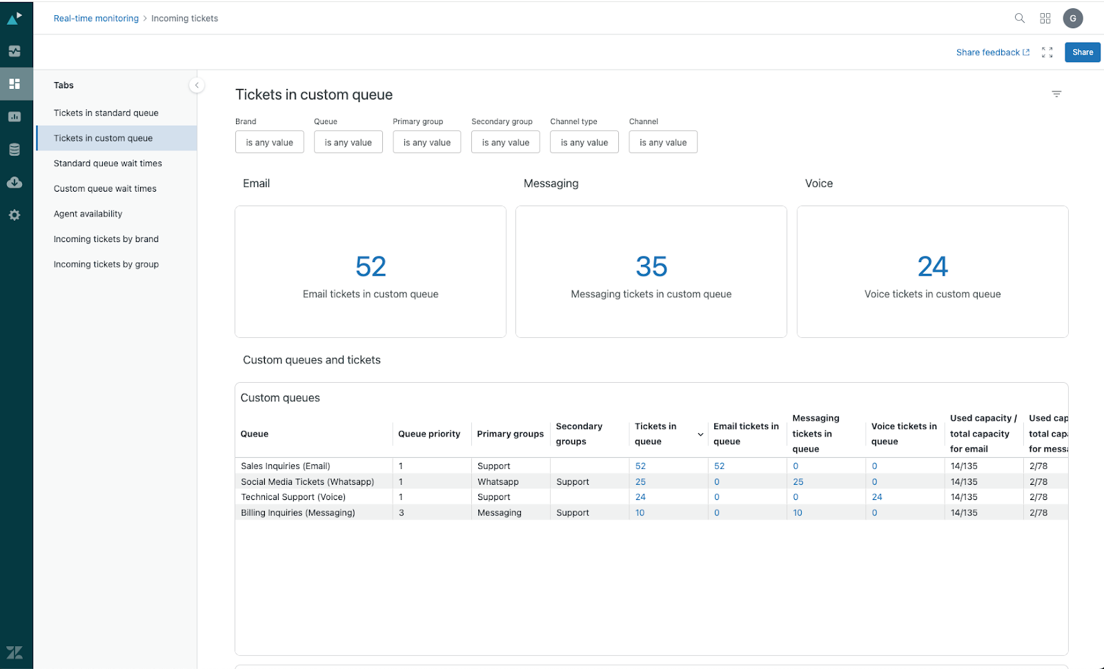 tickets in your custom queues, including groups, brands, ticket skills, channel