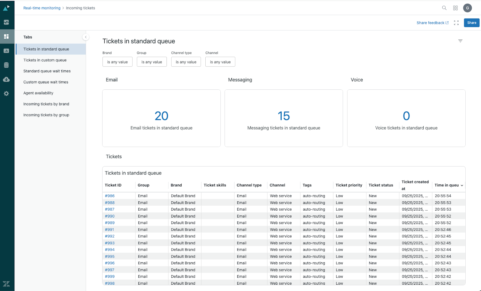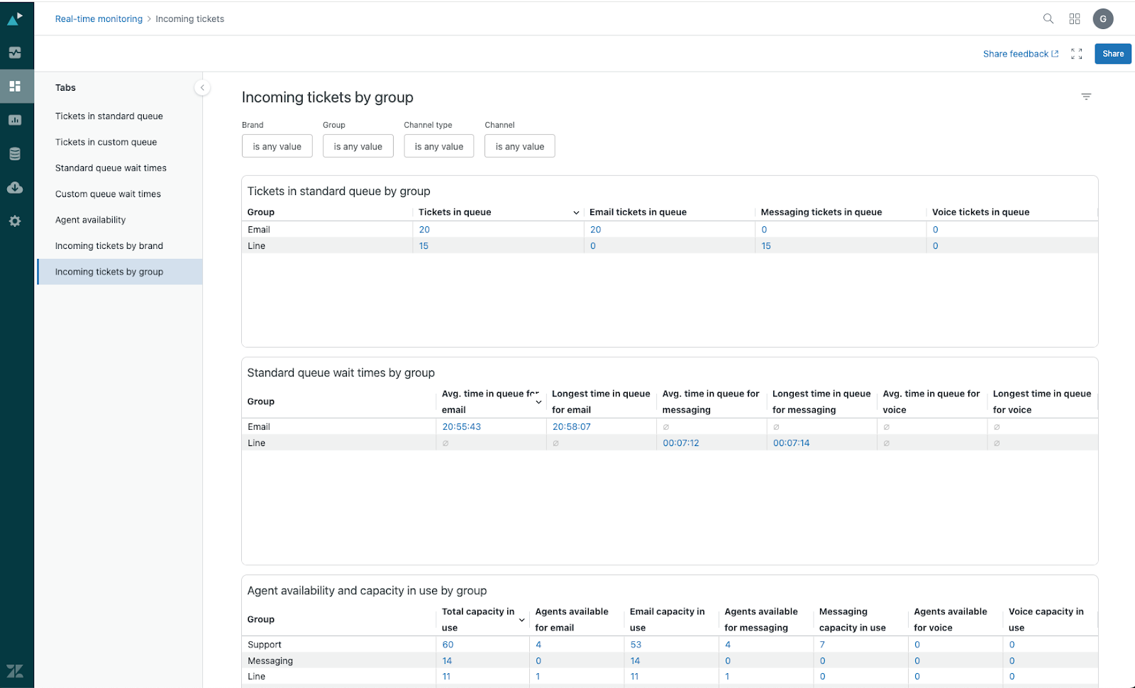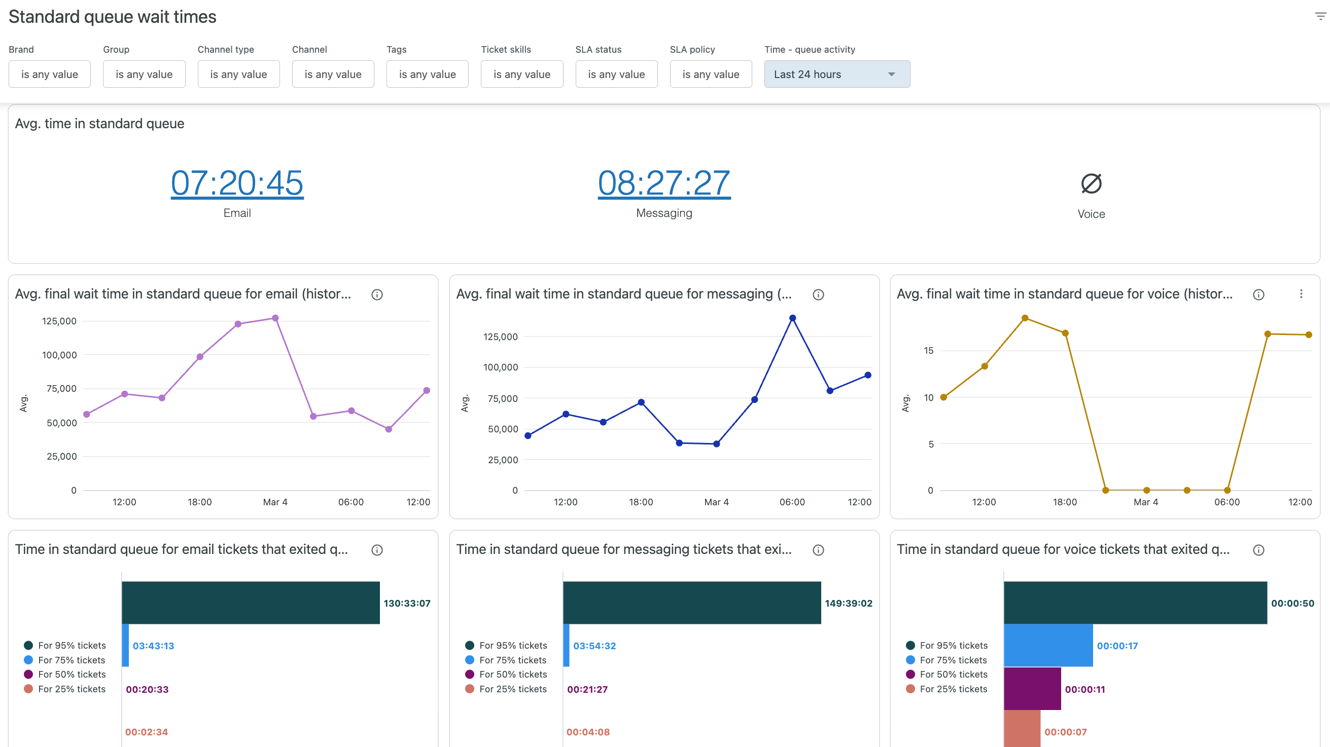 - Tickets in standard queue: Displays information about all tickets in your standard queue, including groups, brands, skills, channel, time in queue, and more.