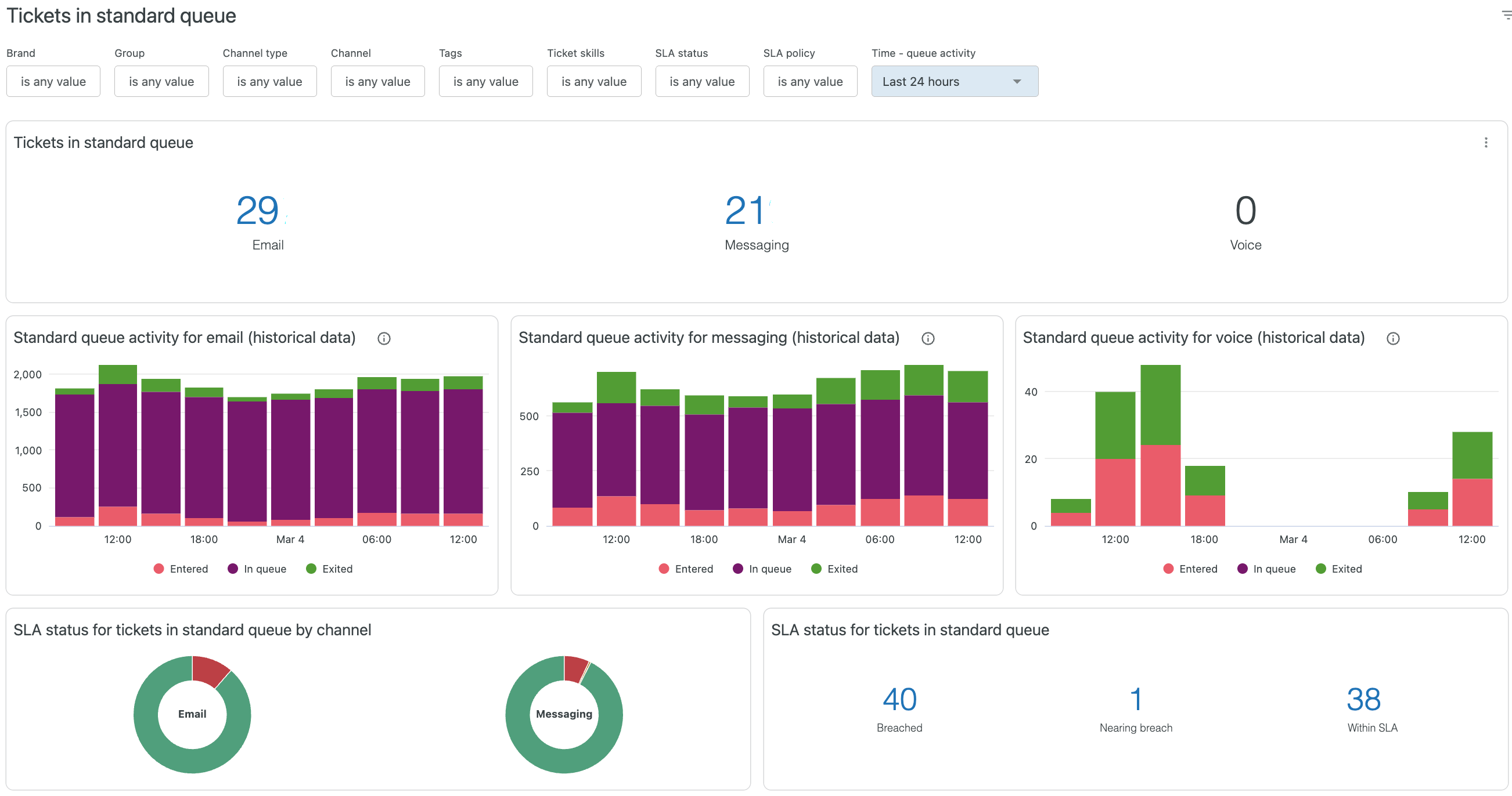 - SLA status for tickets in standard queue by brand: The SLA status of tickets in your standard queue by brand.
