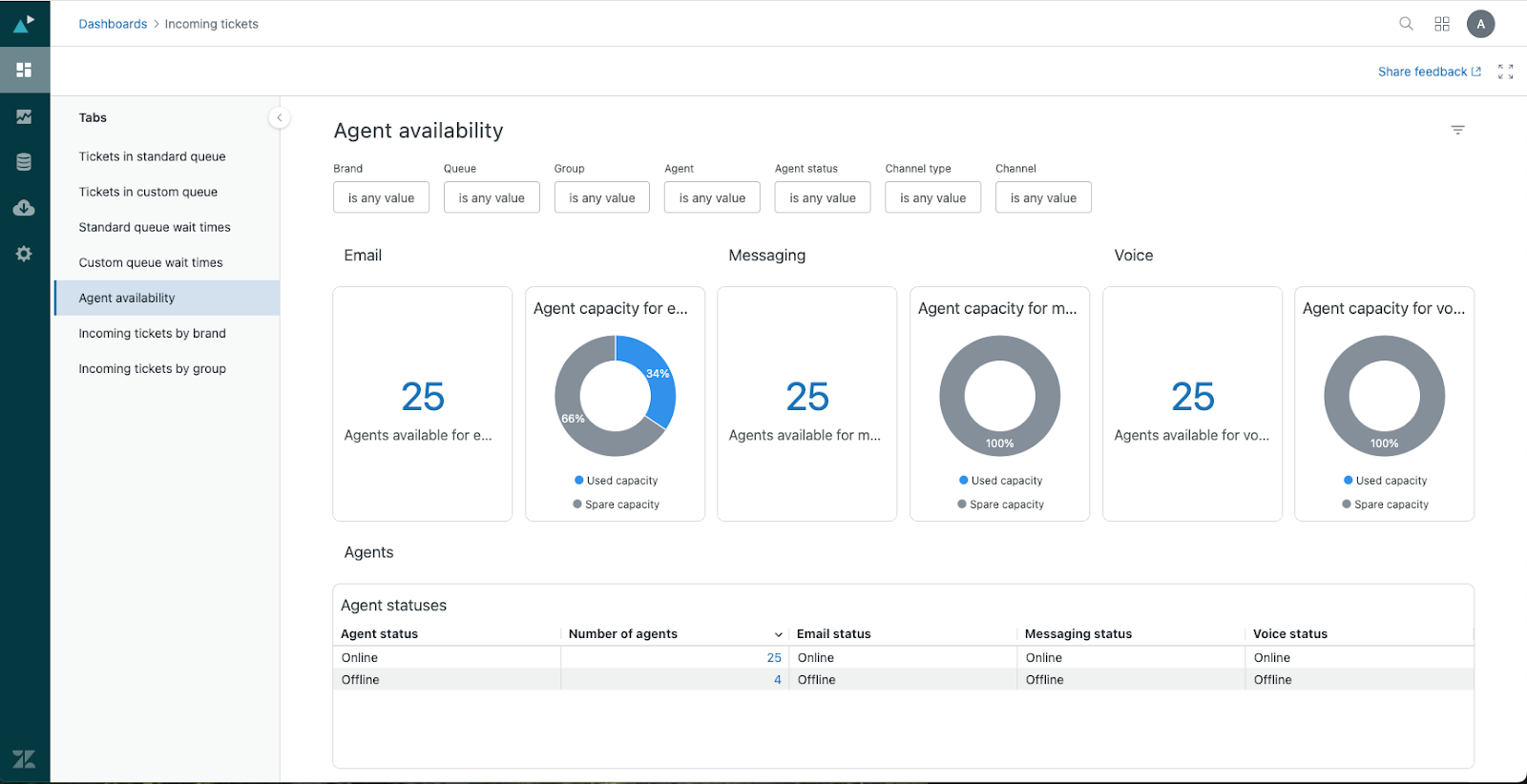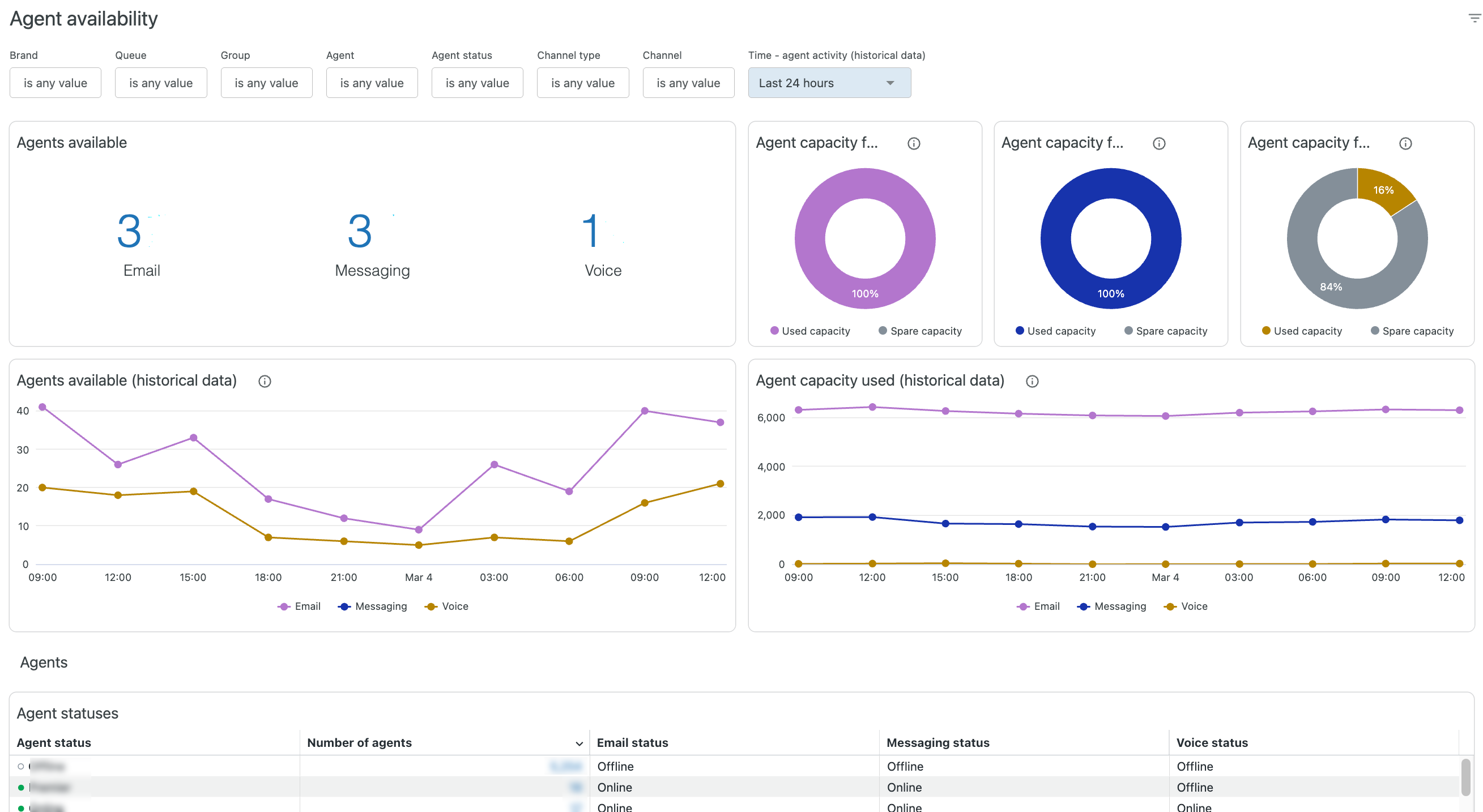 - Agent statuses: A detailed breakdown of your agent’s showing their status for each channel, email, messaging, and voice. You can click any value under Number of agents to drill-in and see the agents with that status.