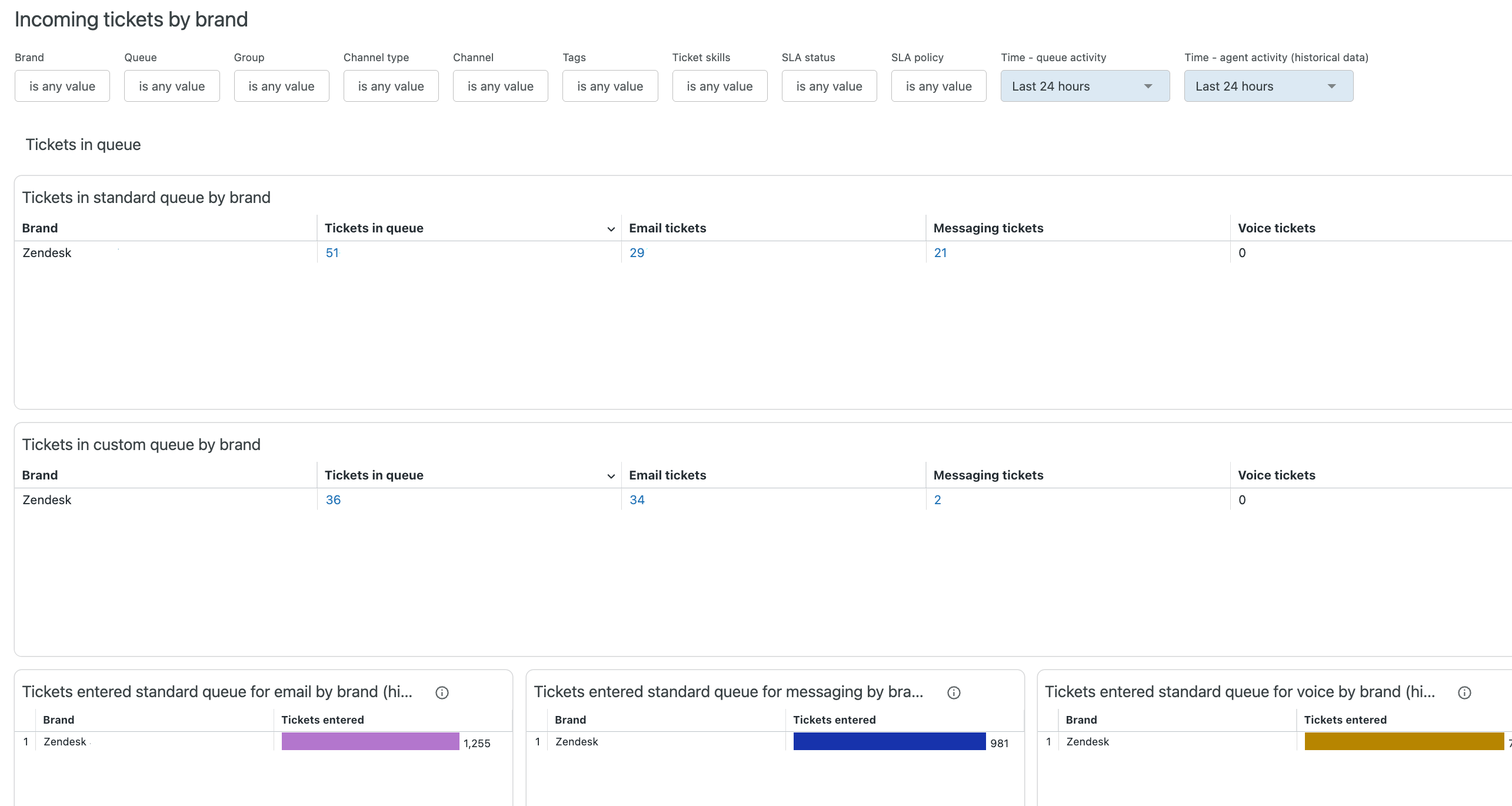 - Tickets in custom queue by brand: For each of your brands, displays the brand name and the number of email, messaging, and voice tickets in the custom queue. You can click any of the numeric values to drill into more detailed information.