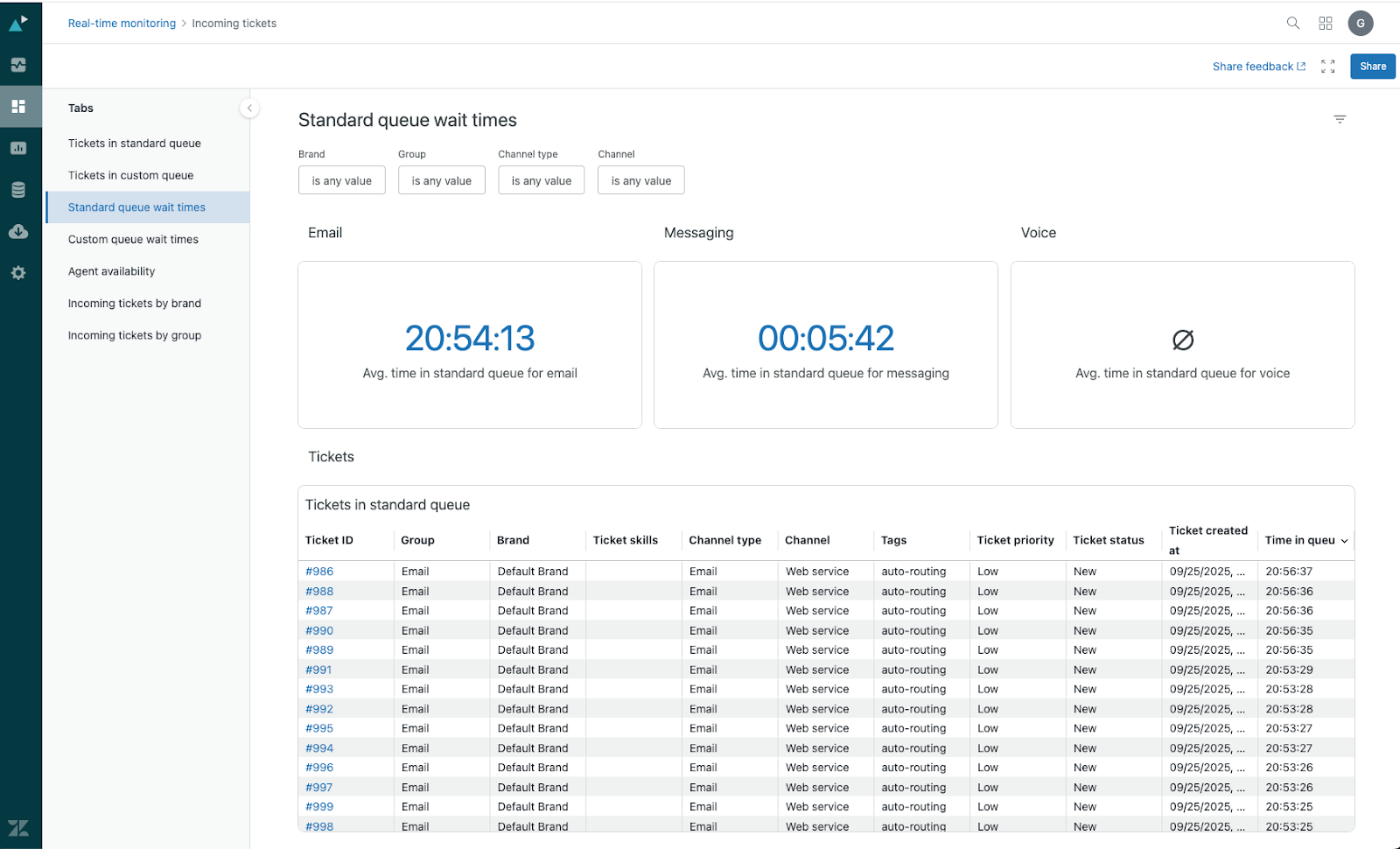 - Tickets in standard queue: Displays information about all tickets in your standard queue, including groups, brands, ticket skills, channel type, tags, ticket created at, time in queue, and more.