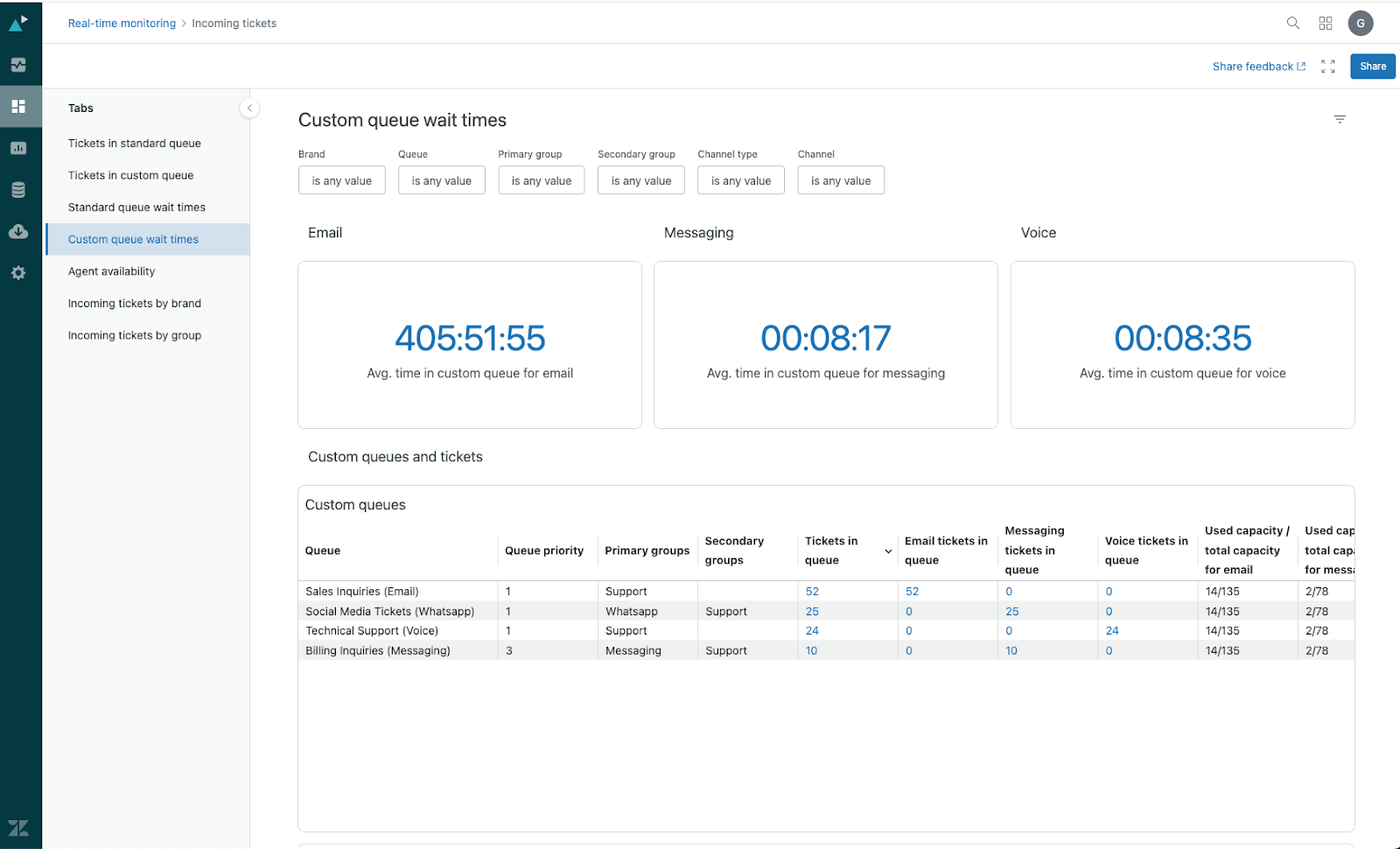 - Custom queues: Displays information about all of your custom queues, including priorities, tickets in the queue, and agent availability and capacity, as well as the longest and average time in the queue for all tickets in a queue.