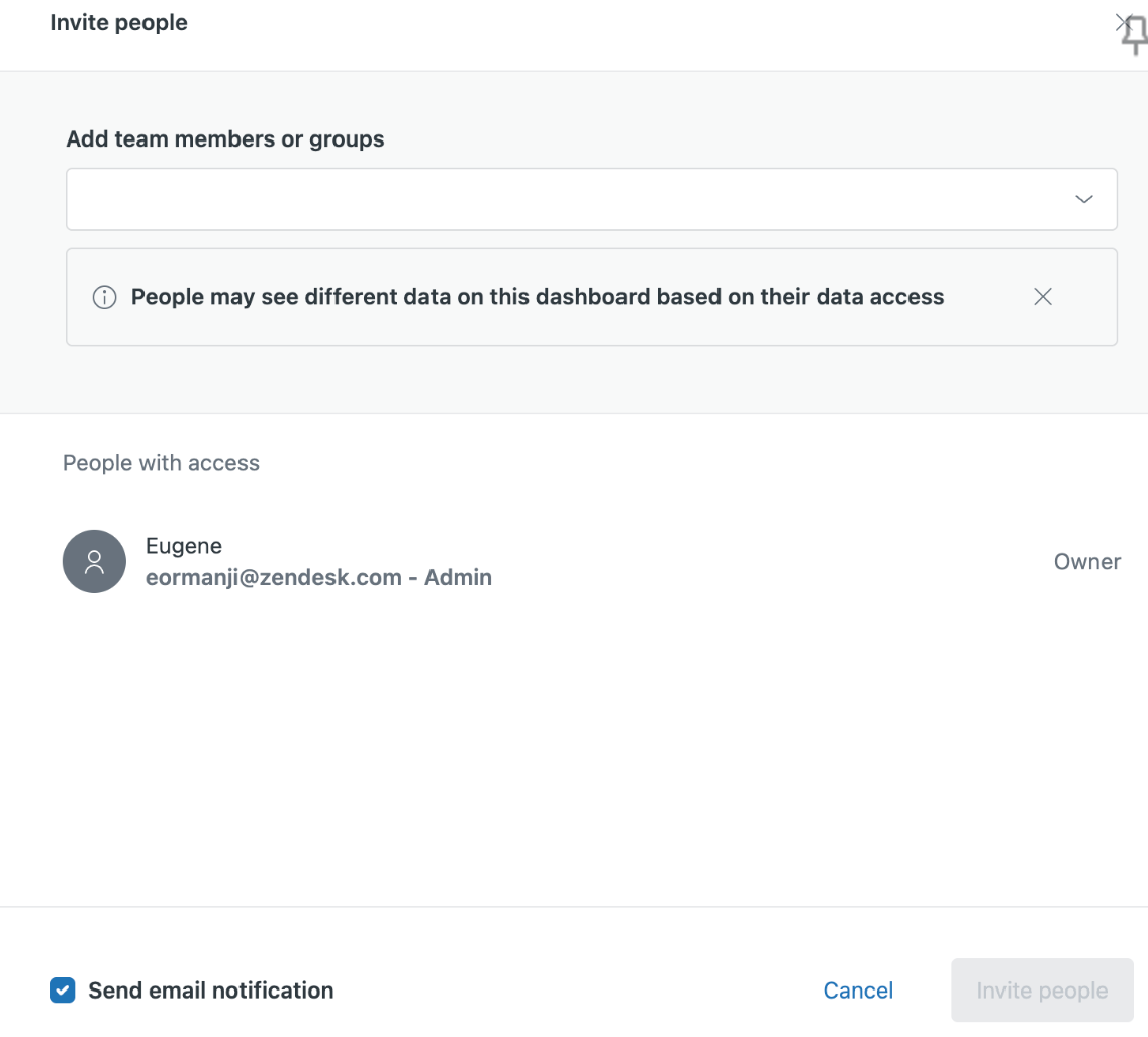 - On the Invite people page, enter the team members or groups who you want to share this dashboard with. You can also select to send them an email invitation to view the dashboard.
