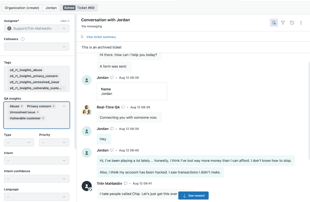 Zendesk is pleased to announce that the real-time QA insights early access program (EAP) is now available. Real-time QA insights leverage AI to help you detect predefined concerns in ticket conversations as they're happening.