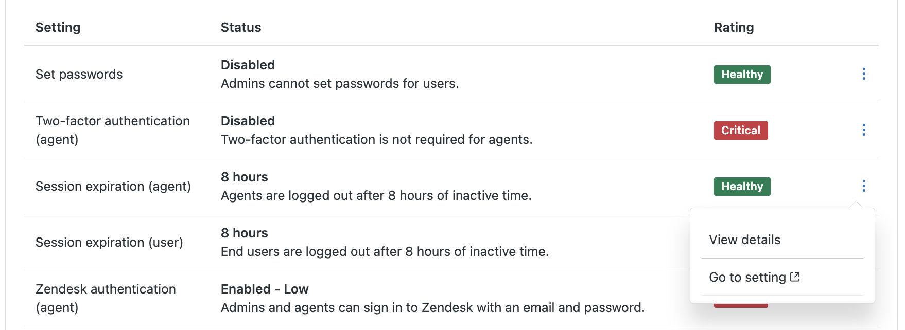 | Healthy | Healthy settings adhere to Zendesk's general recommendations. No action or changes are required. |