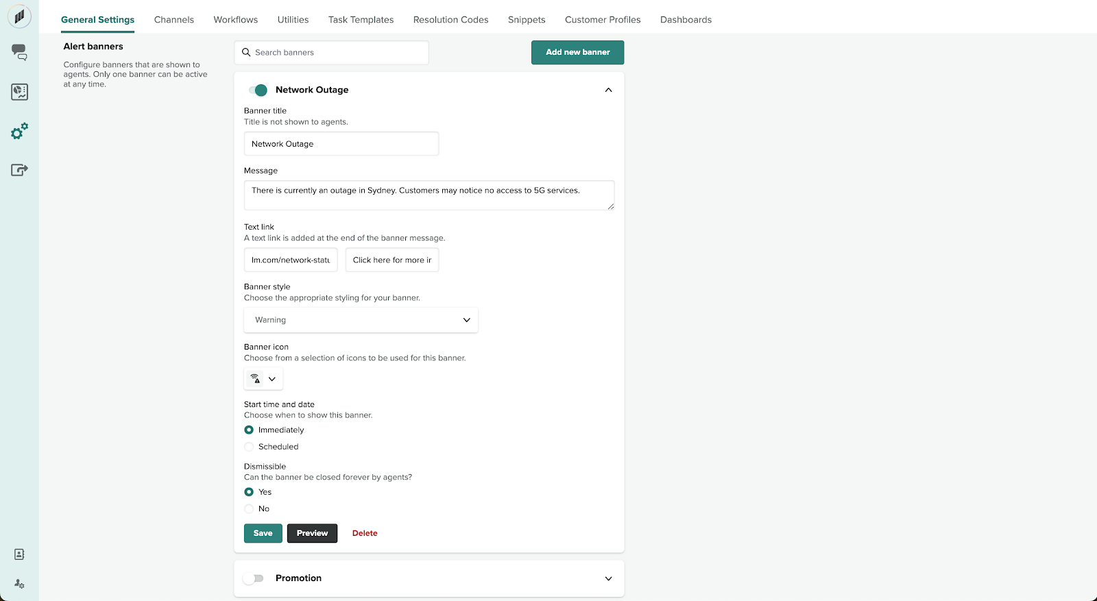 Alert banners make it easy for you to communicate important information, such as network outages, flight delays, or severe weather to your team, ensuring that they have the relevant information when communicating with customers.