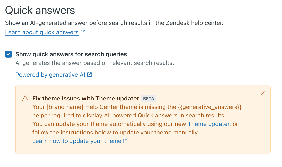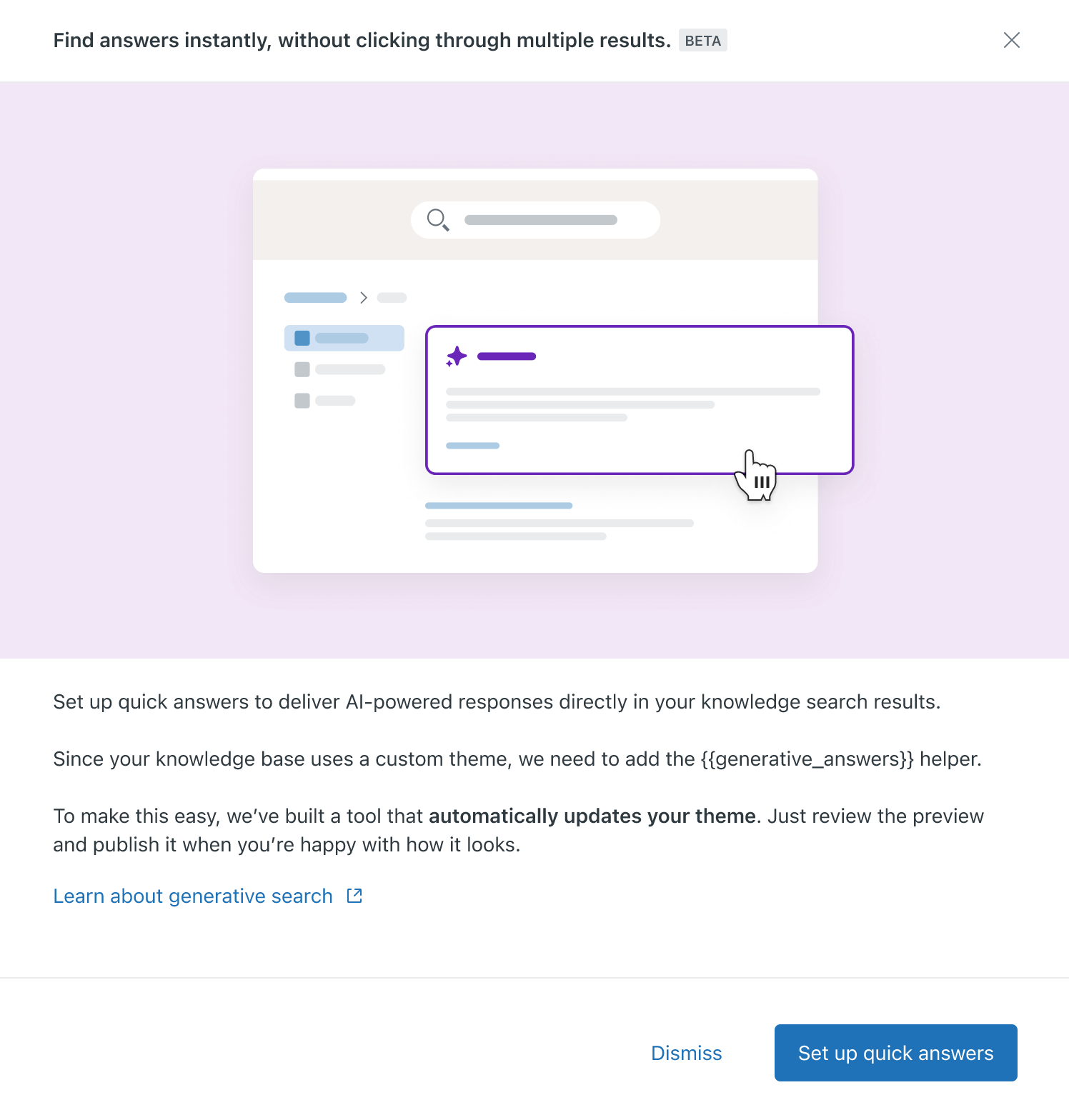 Generative search is available by default in standard themes released after March 26, 2025. If your help center uses a customized theme and does not have the {{generative_answers}} helper implemented, you must update your custom theme to add the {{generative_answers}} helper.