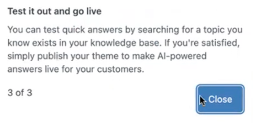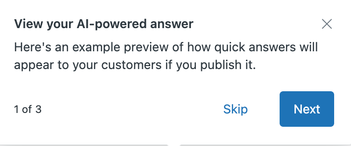This view shows you what users will see when they perform help center searches with generative search. You can test quick answers with your own queries to see how quick answers will appear to end users before moving on to the next step.