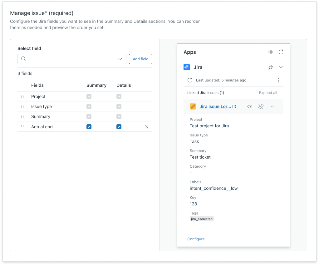 Zendesk admins can customize the app to display the Jira fields most relevant to agents handling tickets. This configuration process involves adding the desired Jira fields to the app and organizing them within the Summary and Details sections of the sidebar.