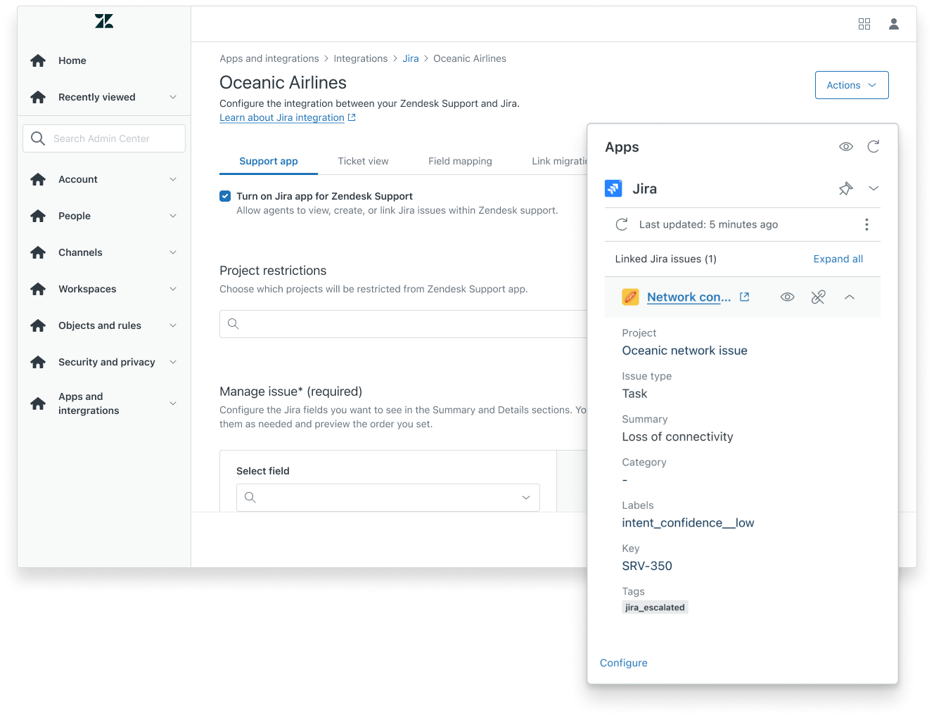 Configure the Jira app to create and view linked Jira issues from tickets. Customize the integration by excluding specific Jira projects, adding or removing fields in the app sidebar, and enhancing the issue creation form with additional fields. You can also turn off the app temporarily without disconnecting accounts, allowing flexibility during setup and configuration.