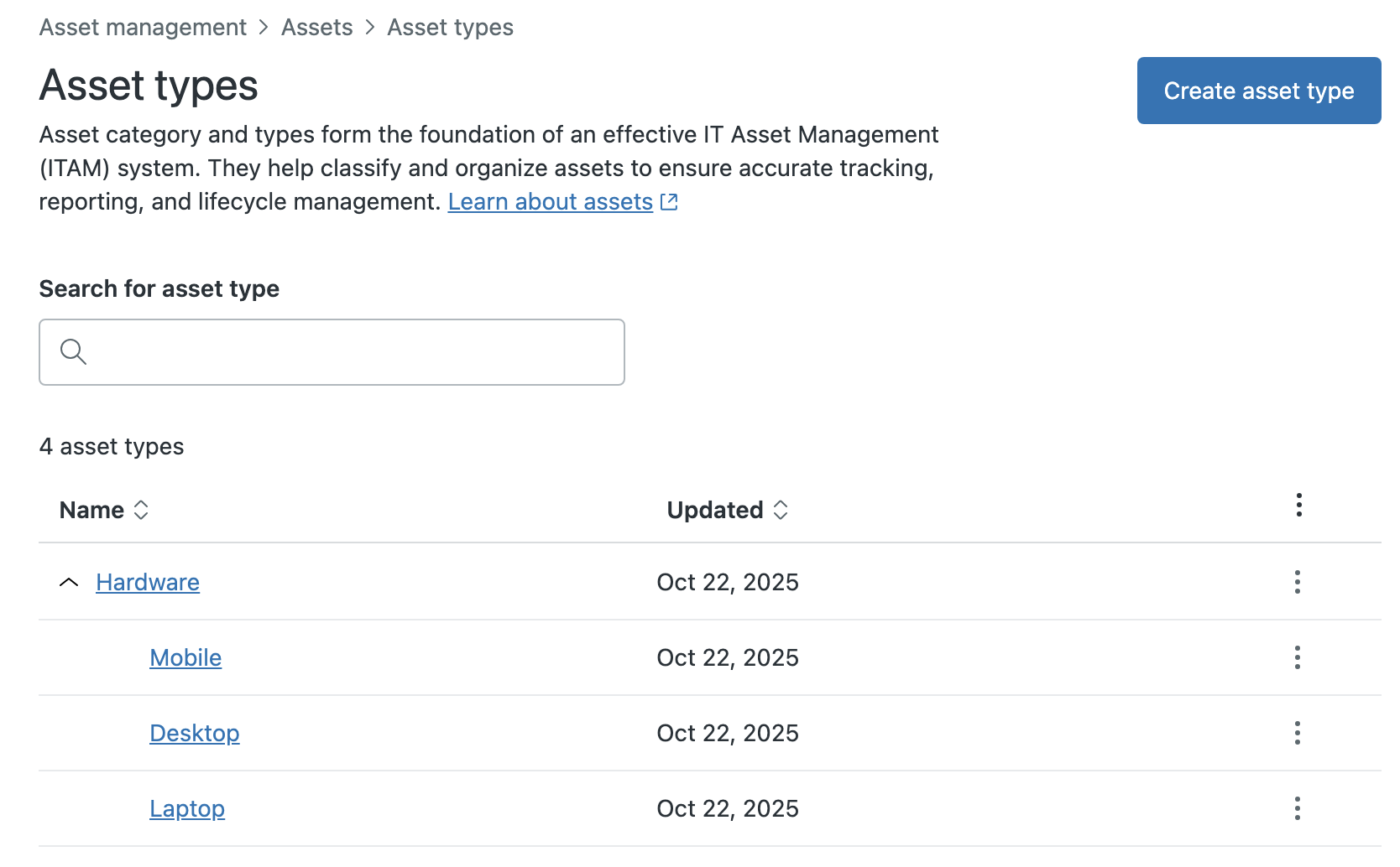 Asset management in the sidebar, then select Assets > Types. - Click Create type.