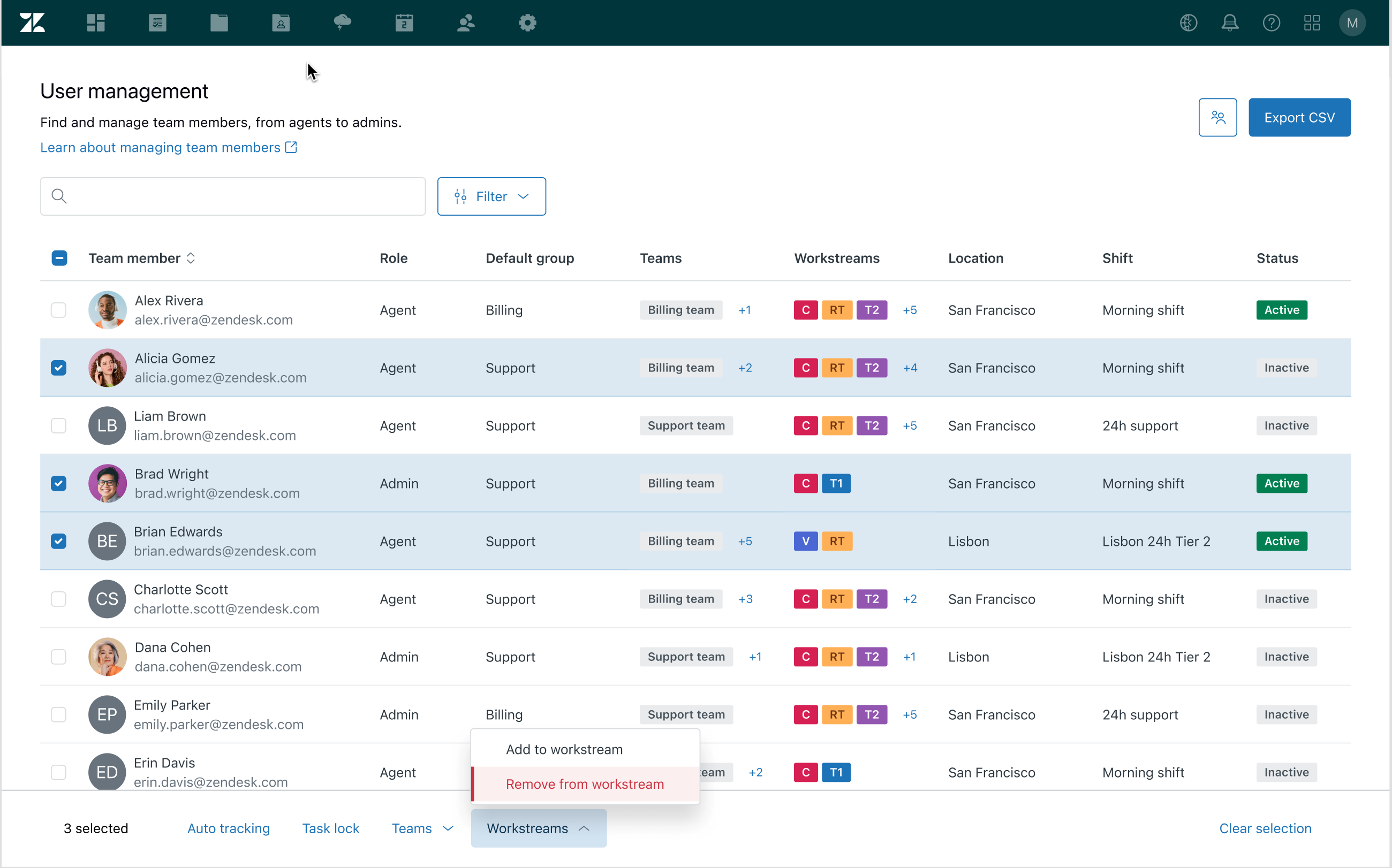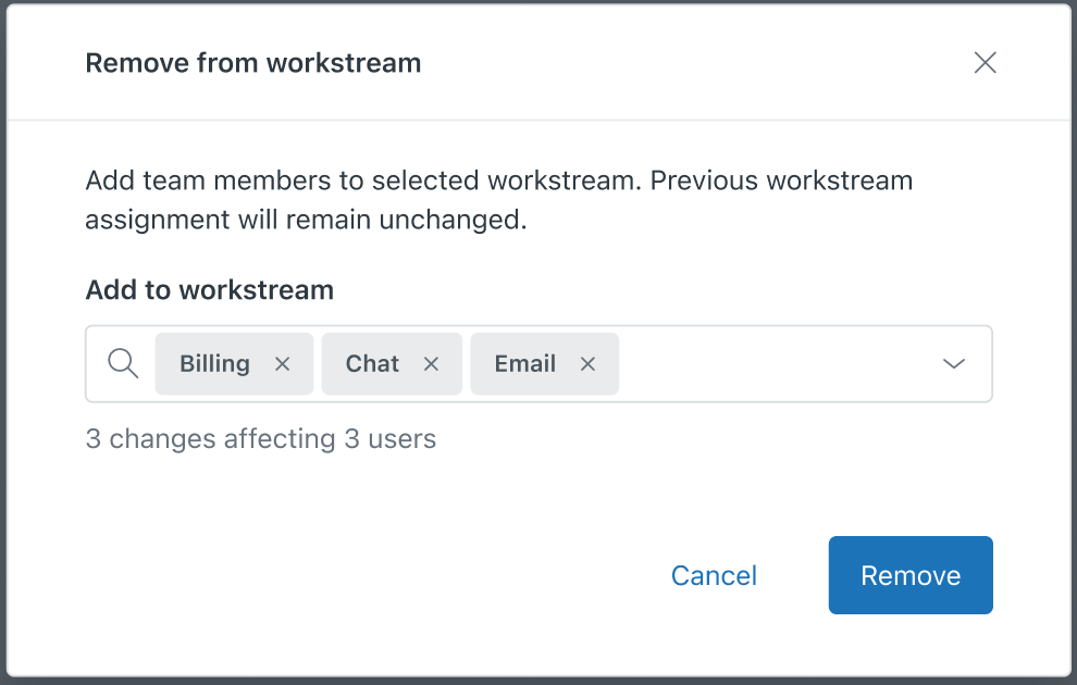 Workstreams are part of your organization structure and a building block of Zendesk Workforce management (WFM). Many features are based on workstreams, so accurately maintaining which users are in each workstream is essential. To make this easier, WFM admins can add and remove users from multiple workstreams at once.