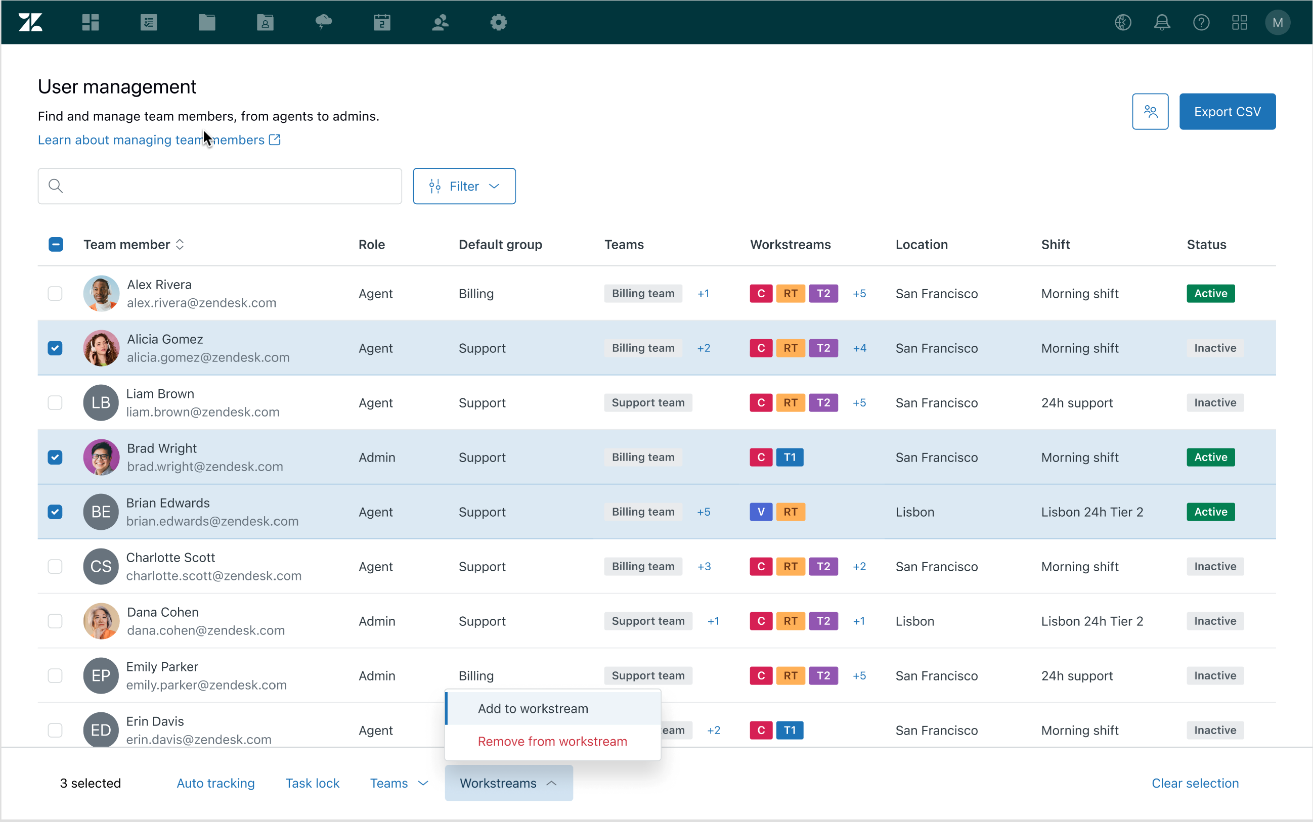 Zendesk Workforce Management (WFM) is enhancing WFM user management by releasing bulk user management for workstreams. You can now add and remove users from multiple workstreams at once.