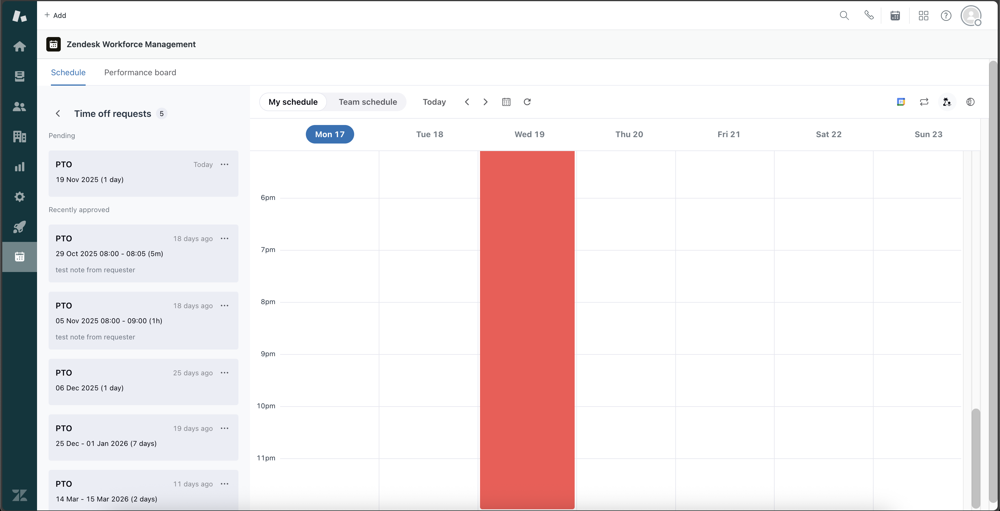 Zendesk Workforce Management (WFM) is expanding the window of time off requests displayed to agents on their agent schedule sidebar in Zendesk Support.
