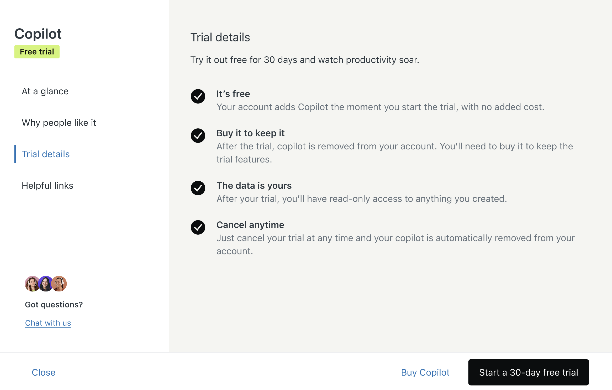 - To try out an add-on or plan upgrade, click See trial details, then follow the onscreen instructions. You’ll see details about the free 30-day trial period along with information on how to start the trial. For example:
