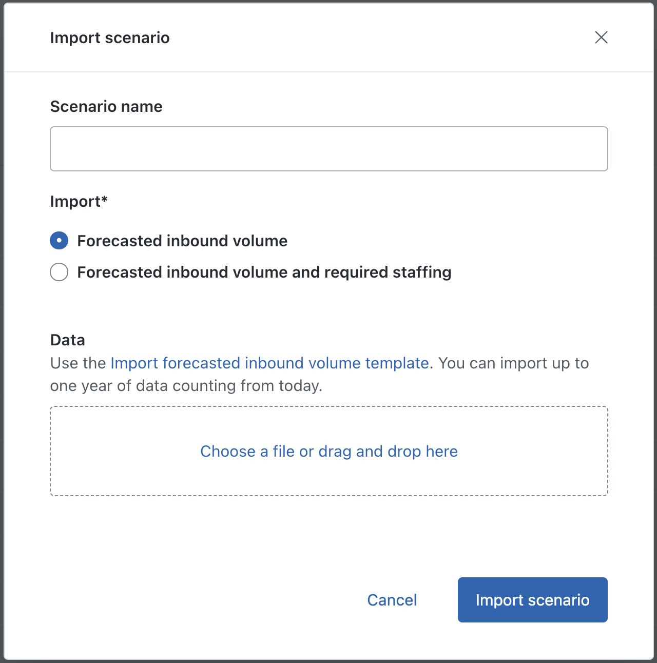- (Optional) If you selected Forecasted inbound volume and required staffing, download and use the Import required staffing template. You can import up to one year of data counting from today.