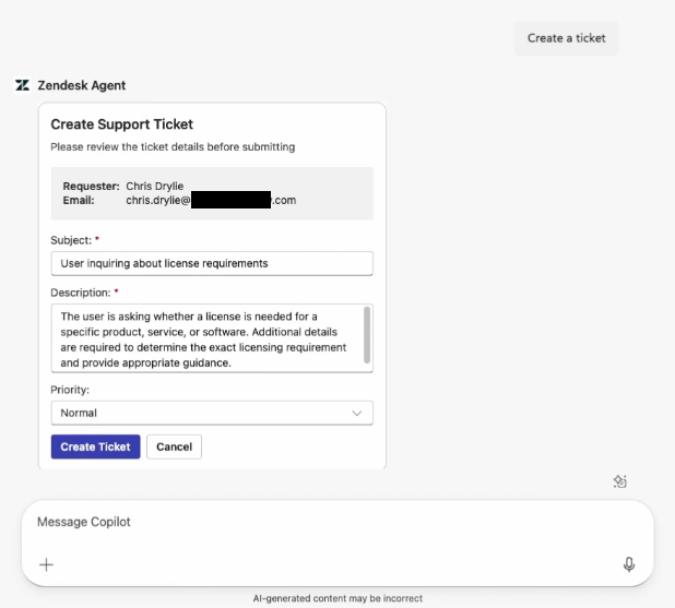 If your admin has activated ticket creation capabilities for the Zendesk agent, you can create support tickets in Microsoft 365.