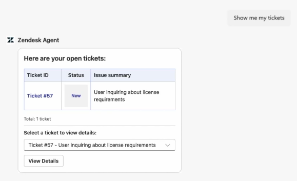The Zendesk agent for Copilot lets you manage your support requests directly in Microsoft 365. Search help center articles or create, view, and update your tickets without switching applications.