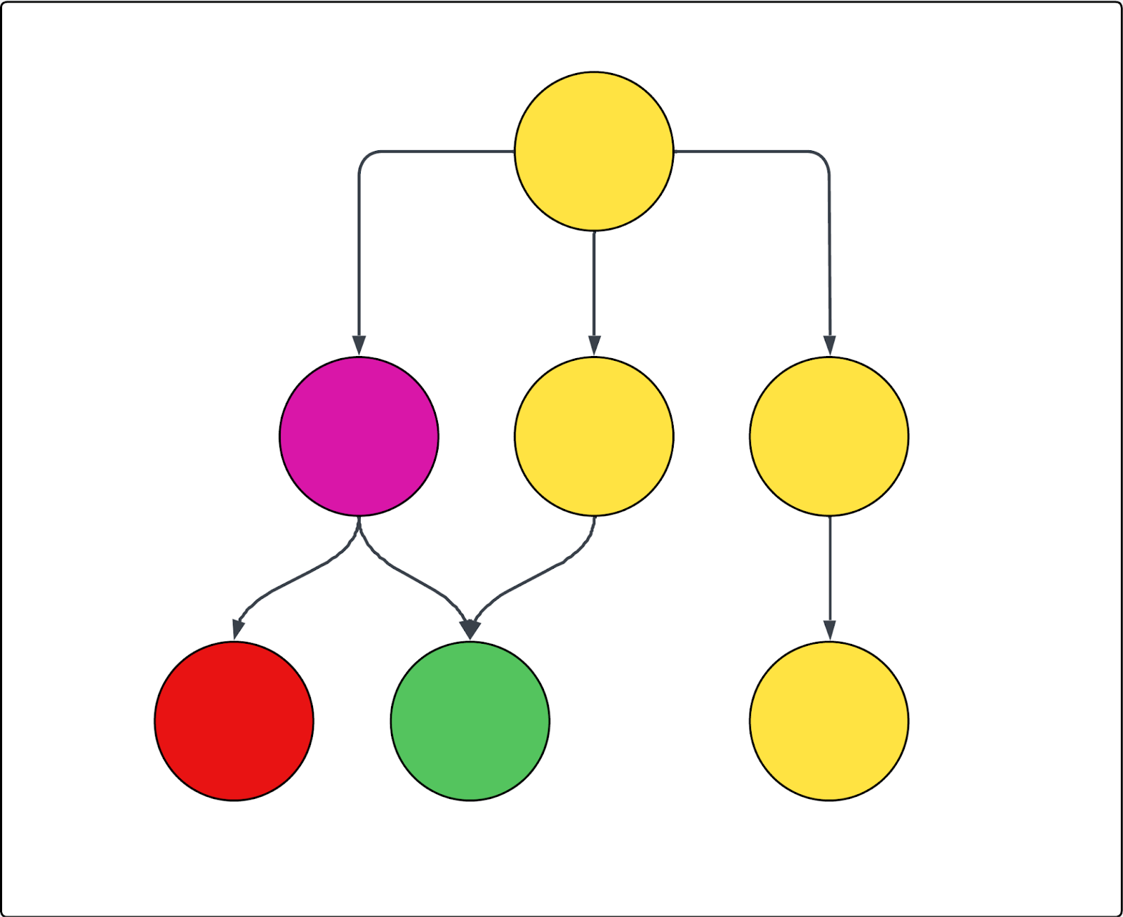 See the following diagram as an example. Each circle represents a page, and each arrow represents a link from that page. If the crawl starts at the top page (as in, it’s the only Start URL) and the purple page is excluded, then the following is true: