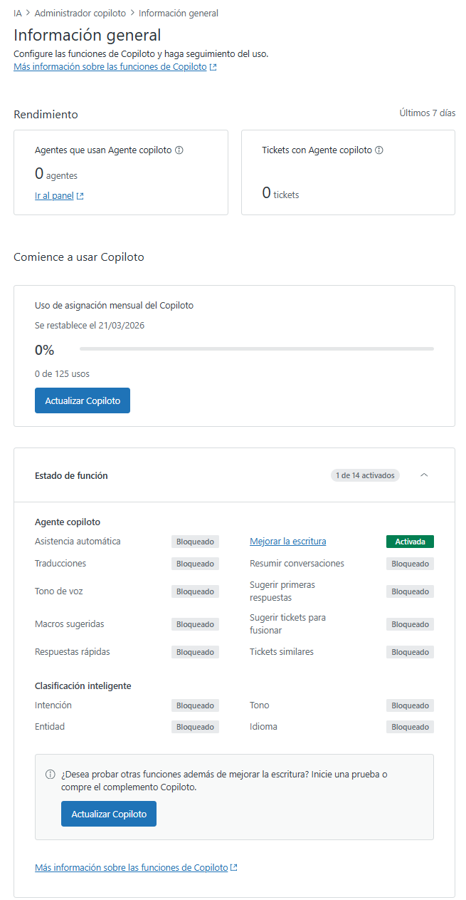 - Cuando se llega al límite de uso mensual, el acceso a la función entra en pausa hasta que se inicie el siguiente ciclo de facturación. Los agentes reciben una notificación en la interfaz de tickets.