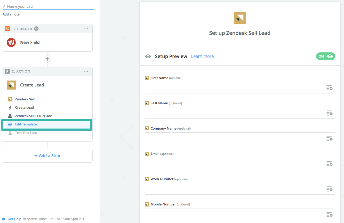- En el panel Action para la acción Create Lead de Sell, elija Edit Template para mapear las entradas del formulario de Wufoo con los campos de Sell.