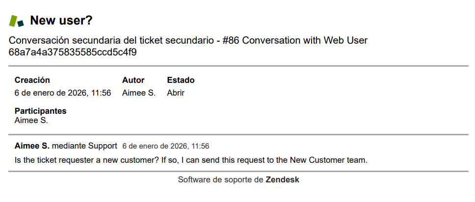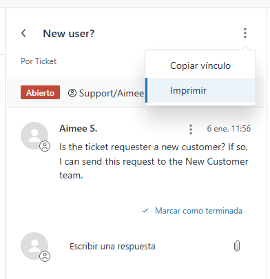 Es posible crear una versión apta para la impresión de cualquier ticket. Pero solo se pueden imprimir tickets individualmente; no hay una opción de impresión masiva. Si el plan de Zendesk incluye conversaciones secundarias, se pueden incluir en el ticket impreso, o bien se pueden imprimir por separado.