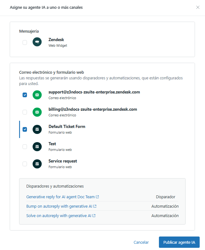 Cuando se elimina un agente IA de un canal de correo electrónico o formulario web o se borra el agente IA por completo, se desactiva el disparador de ticket que se creó al publicar el agente IA por primera vez. Sin embargo, las automatizaciones se deben desactivar manualmente para que no sigan actuando sobre los tickets.