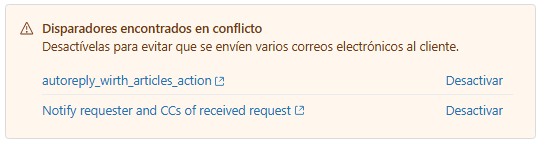 Cuando el sistema crea el disparador, también analiza el sistema para determinar si alguno de los disparadores existentes puede entrar en conflicto con el nuevo. Los conflictos podrían hacer que se envíen varios correos electrónicos a un cliente en respuesta a su solicitud. Si se halla algún disparador conflictivo, recibirá una advertencia con un vínculo a los disparadores causantes del conflicto, para que pueda desactivarlos antes de finalizar la publicación del agente IA.