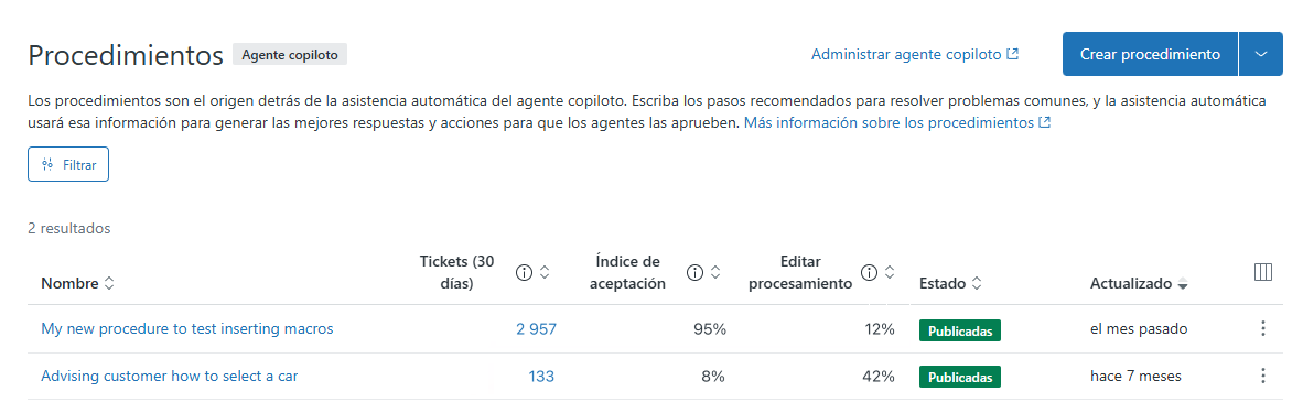 En los procedimientos publicados se muestran las siguientes métricas:- Tickets: número de veces que la asistencia automática aplicó el procedimiento a los tickets en los últimos 30 días.