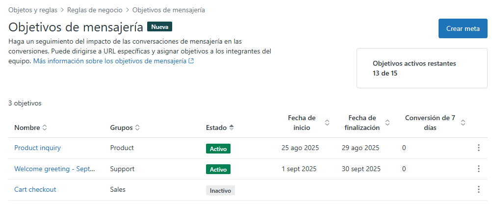Para hacer seguimiento de las acciones del cliente, se pueden utilizar objetivos de mensajería destinados a monitorear actividades específicas de los usuarios y el rendimiento de los agentes. Asigne objetivos a grupos de agentes, vea las conversiones de objetivos en el espacio de trabajo de agente y administre todos los objetivos en la página Objetivos de mensajería. Puede establecer condiciones y periodos de atribución, hacer seguimiento de hasta 15 objetivos activos y exportar los datos de conversión a un archivo CSV para obtener información valiosa y detallada que le ayudará a optimizar las interacciones de soporte y medir el éxito.