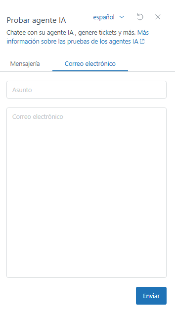 El botón Probar agente IA también sirve para probar el comportamiento de un agente IA en un canal de correo electrónico o formulario web.