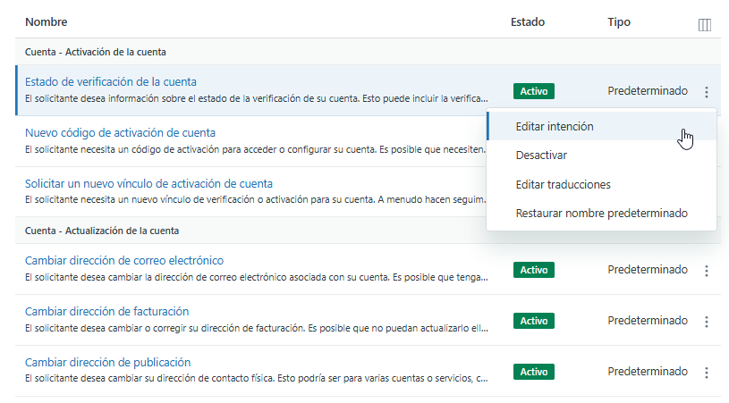 Puede editar y administrar las intenciones predefinidas, las intenciones sugeridas y las intenciones personalizadas que haya creado con solo editar los nombres y las descripciones. Las intenciones también pueden desactivarse y activarse de ser necesario.