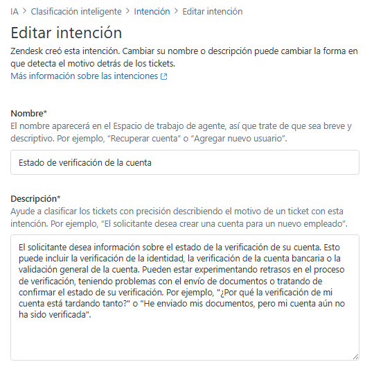 La clasificación inteligente continúa detectando los tickets según la intención original, incluso después de que se hacen cambios. Por esta razón, los nombres de intenciones solo se deben editar para hacer pequeños ajustes en la nomenclatura de la intención, y se deben evitar las actualizaciones que cambien por completo el significado de una intención.