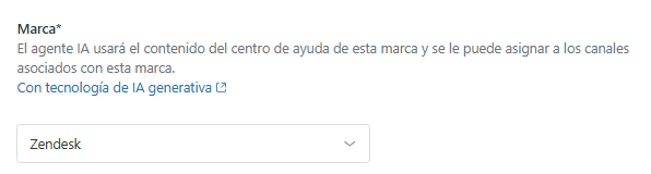 La marca asociada con un agente IA determina qué centro de ayuda usa para crear respuestas generativas. Cuando se crea un agente IA se debe elegir una marca, pero es posible actualizarla en cualquier momento.
