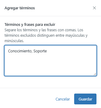 4. En el campo Términos y frases para excluir, agregue los términos que desea excluir de las traducciones, separados por comas.